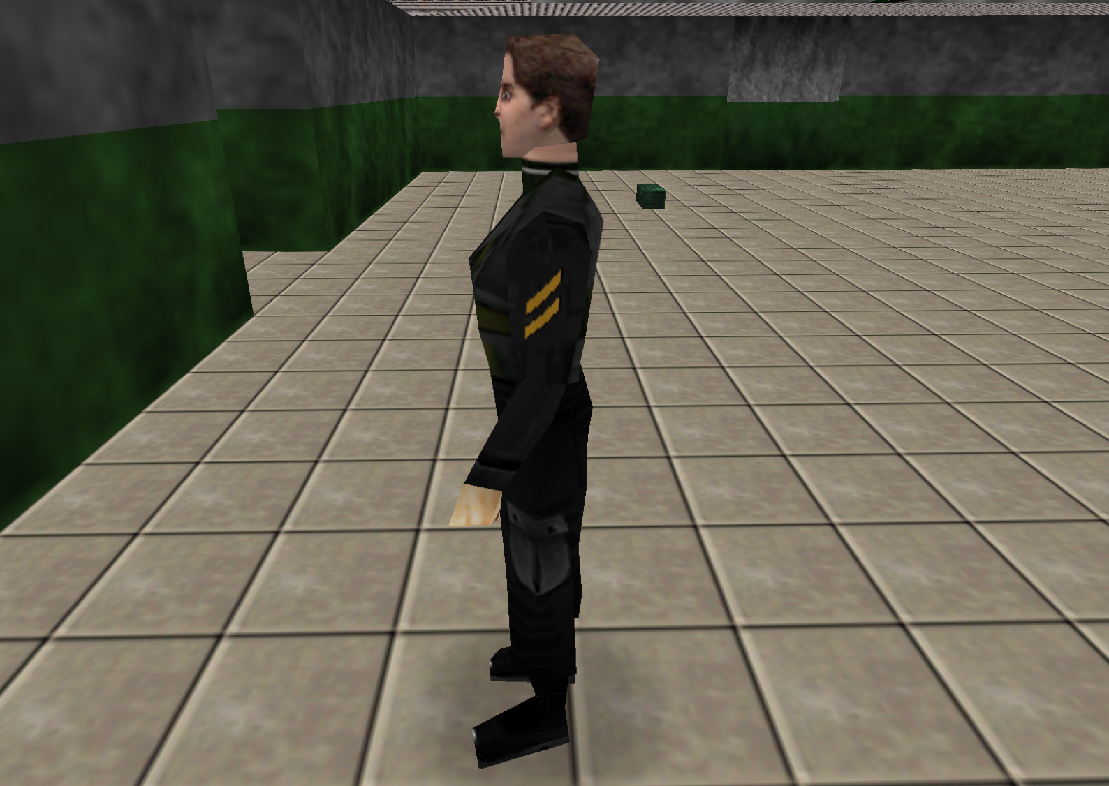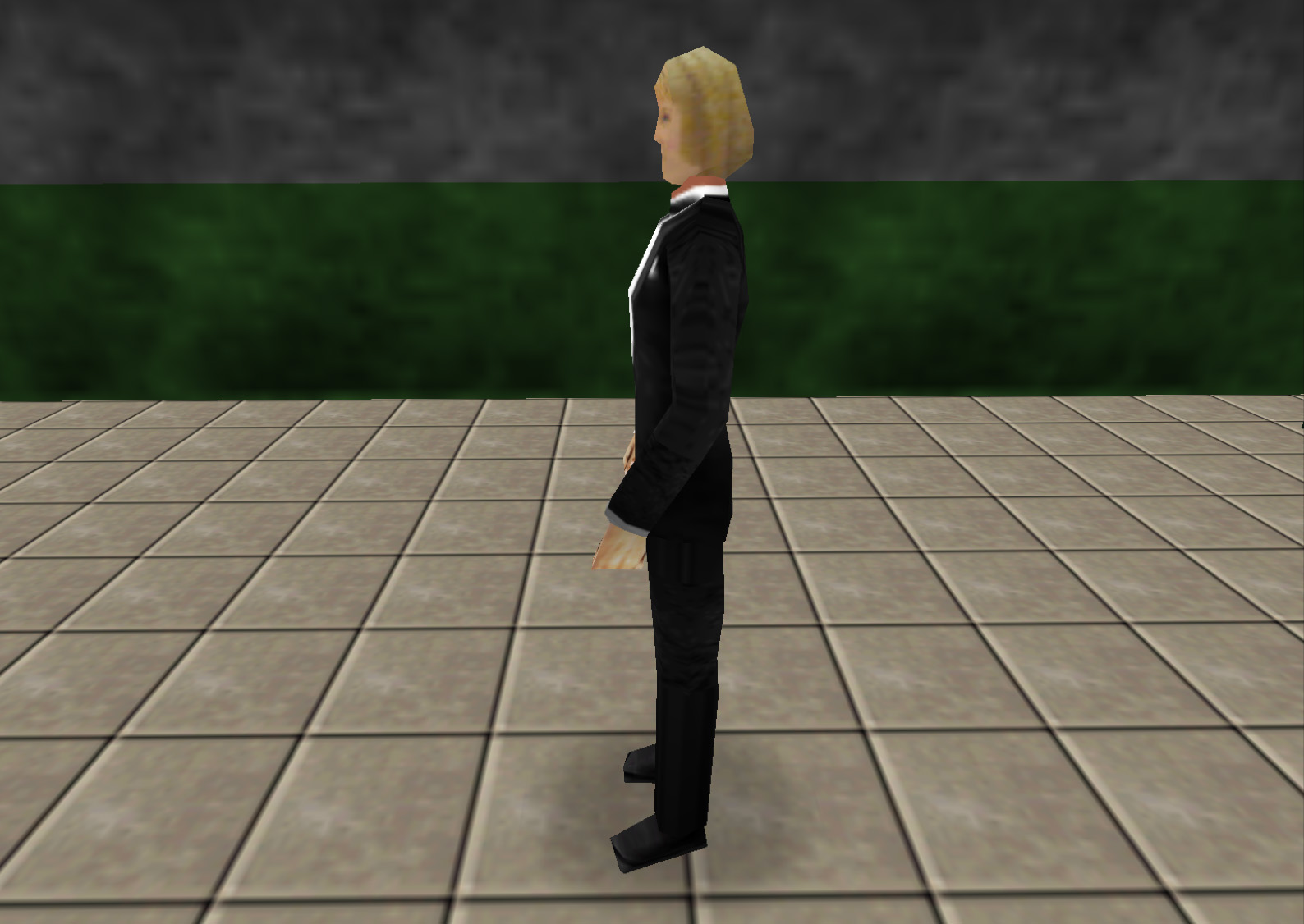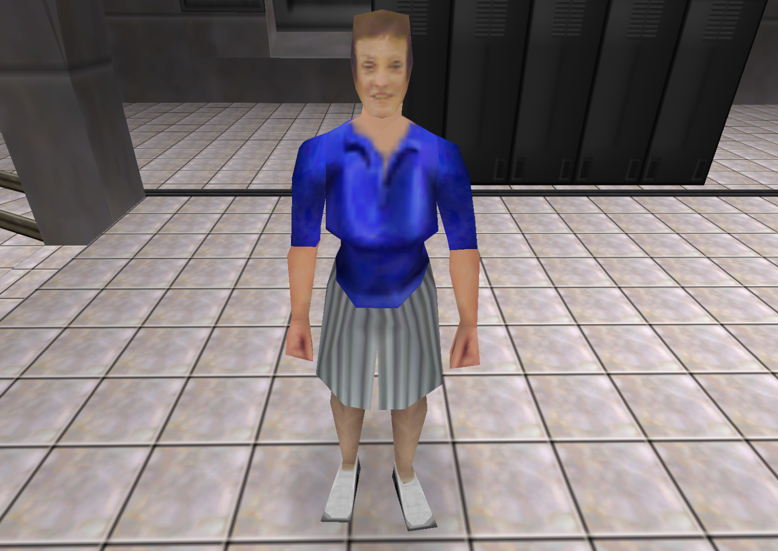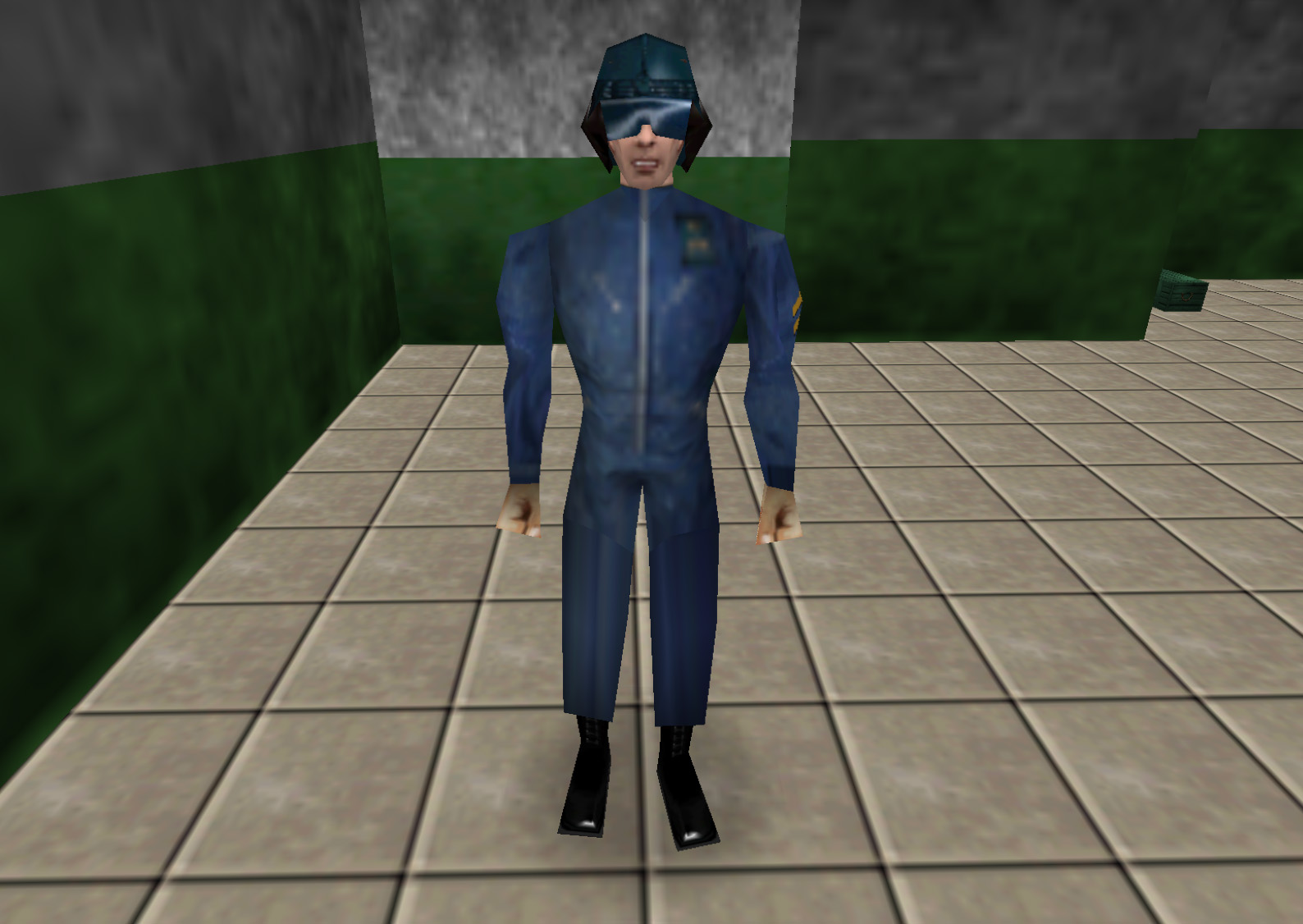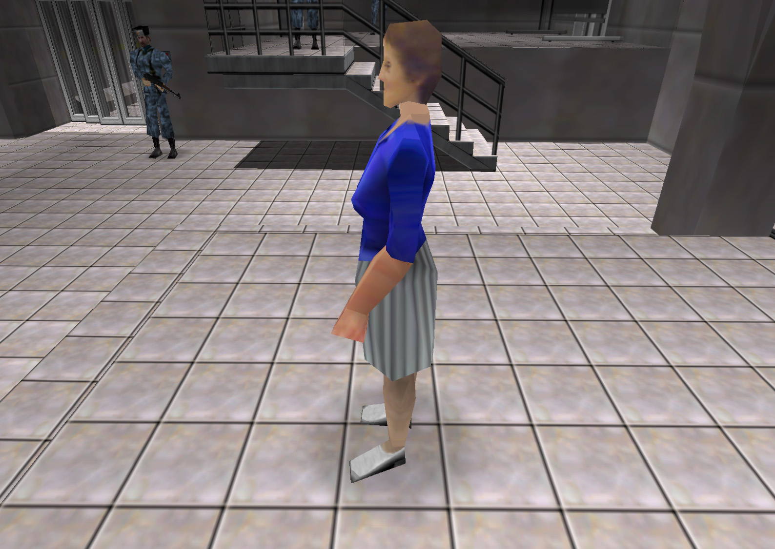 These three characters exist on every GoldenEye ROM, but there is no way to access them without a cheating device. They don't even have official names. I used the GoldenEye Setup Editor to add them to Bunker 2. Blue woman uses a random female head and the other two use a random male head.