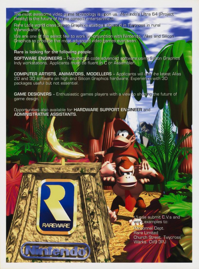 Programmer Mark Edmonds was inspired to apply to Rare after seeing their advertisement in Edge magazine, quite possibly this exact one from the November 1994 issue. (Source: GoldenEye 007 by Alyse Knorr, p. 24)