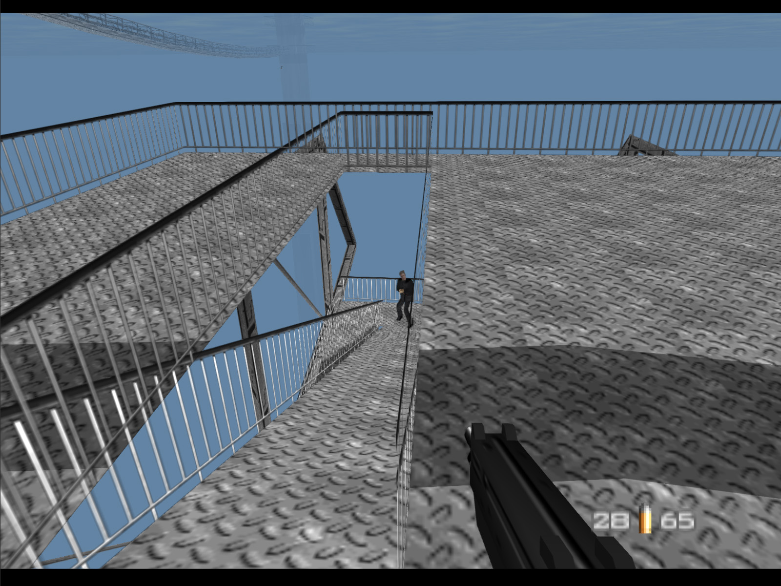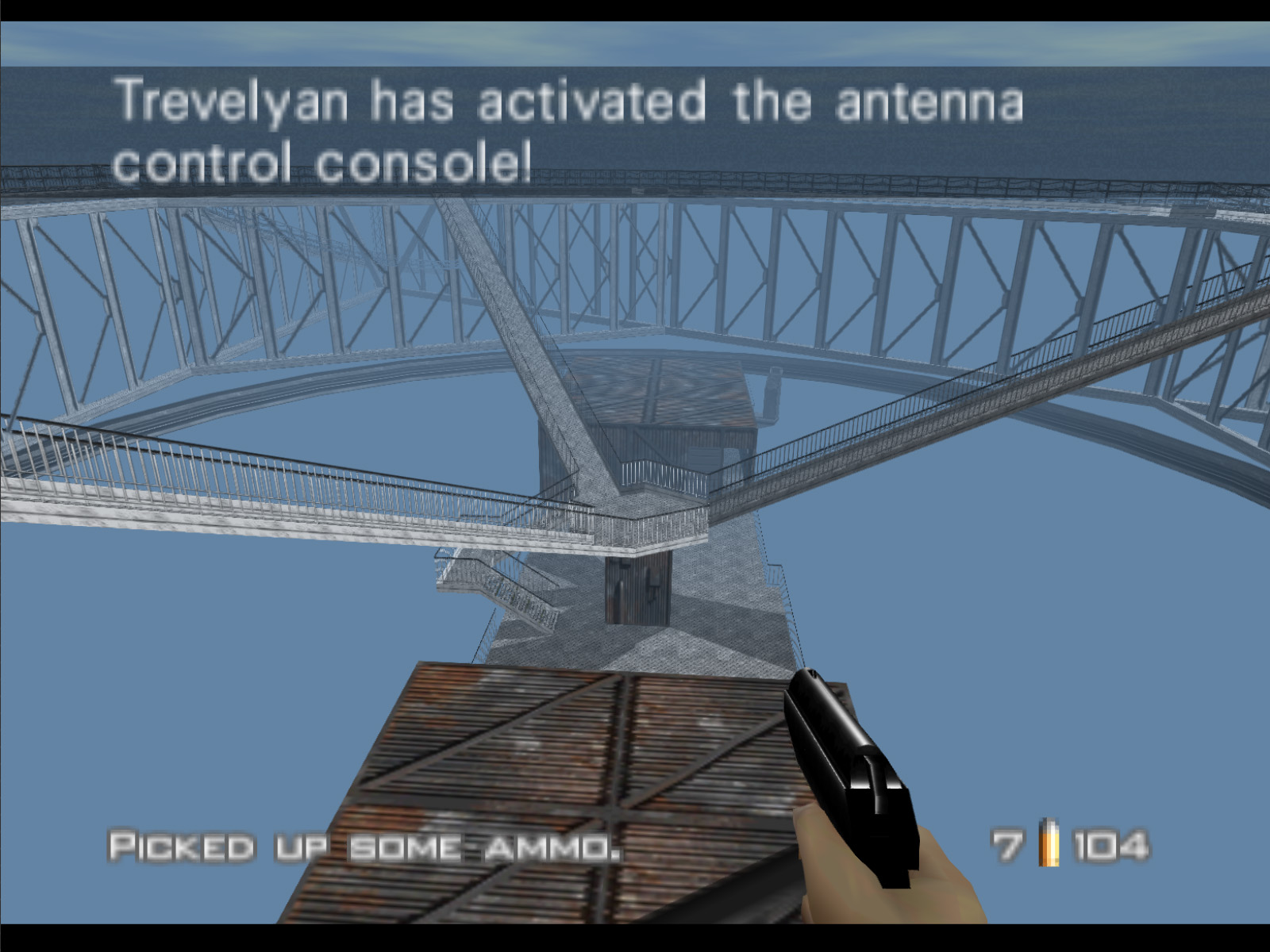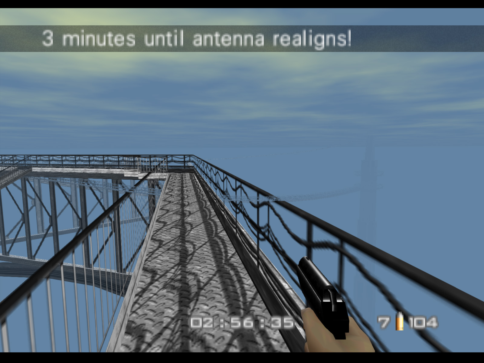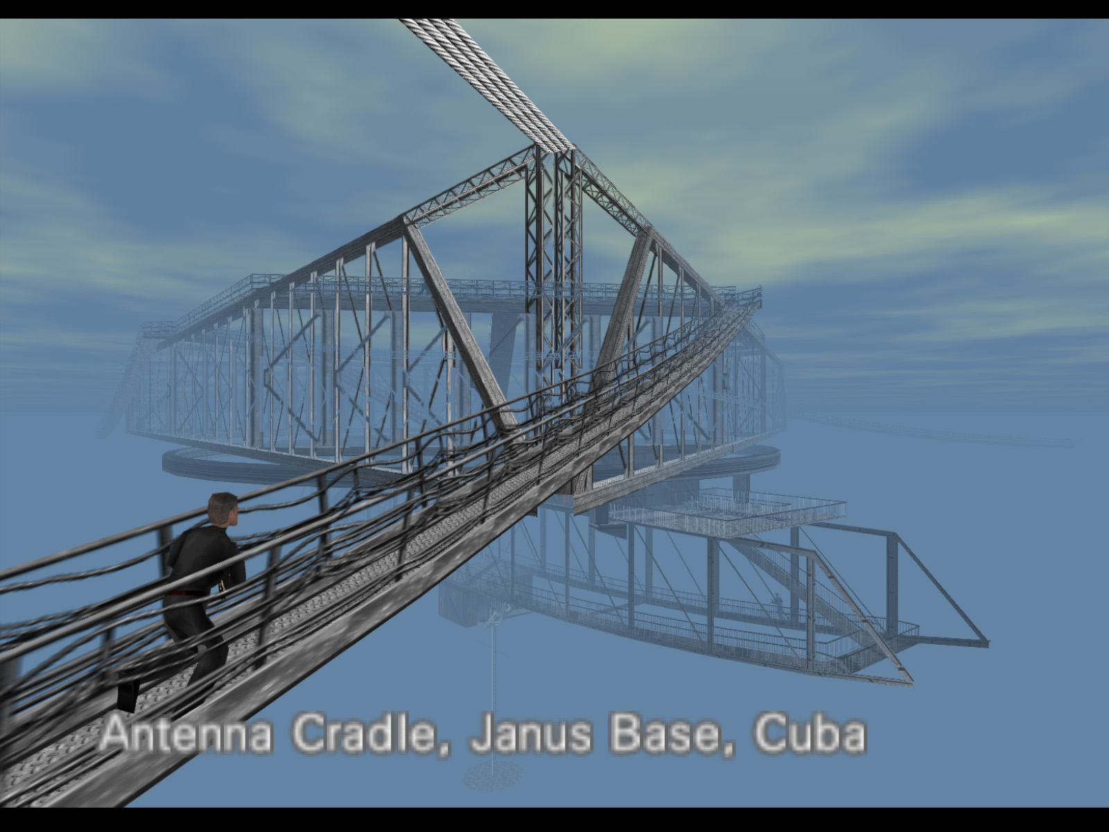The complex observatory had to be simplified for the game. GoldenEye does not attempt to render the dish or surrounding terrain. There is only sky below the player. Even so the Nintendo 64 struggles to render the structure and frame rate suffers. In the game all three support towers are about 98.6 meters high. The distance from the center of the cradle to each support tower is about 106 meters.
