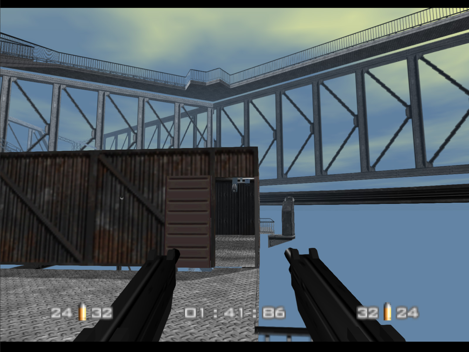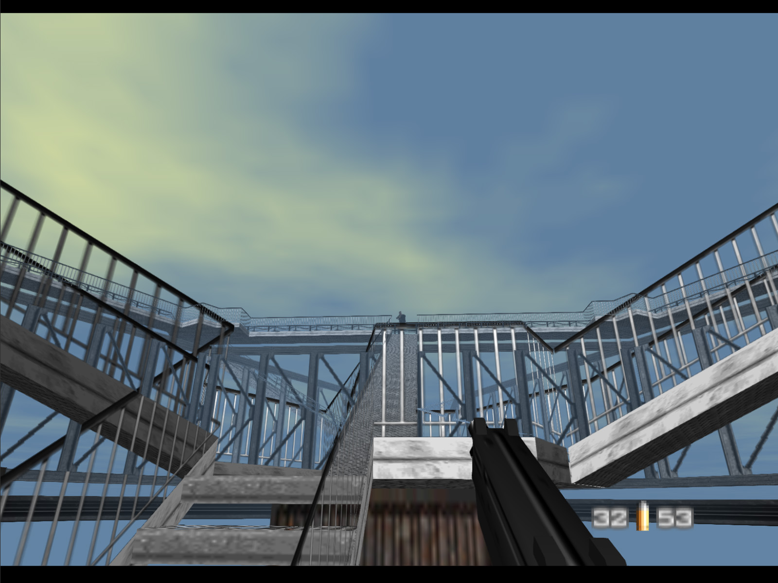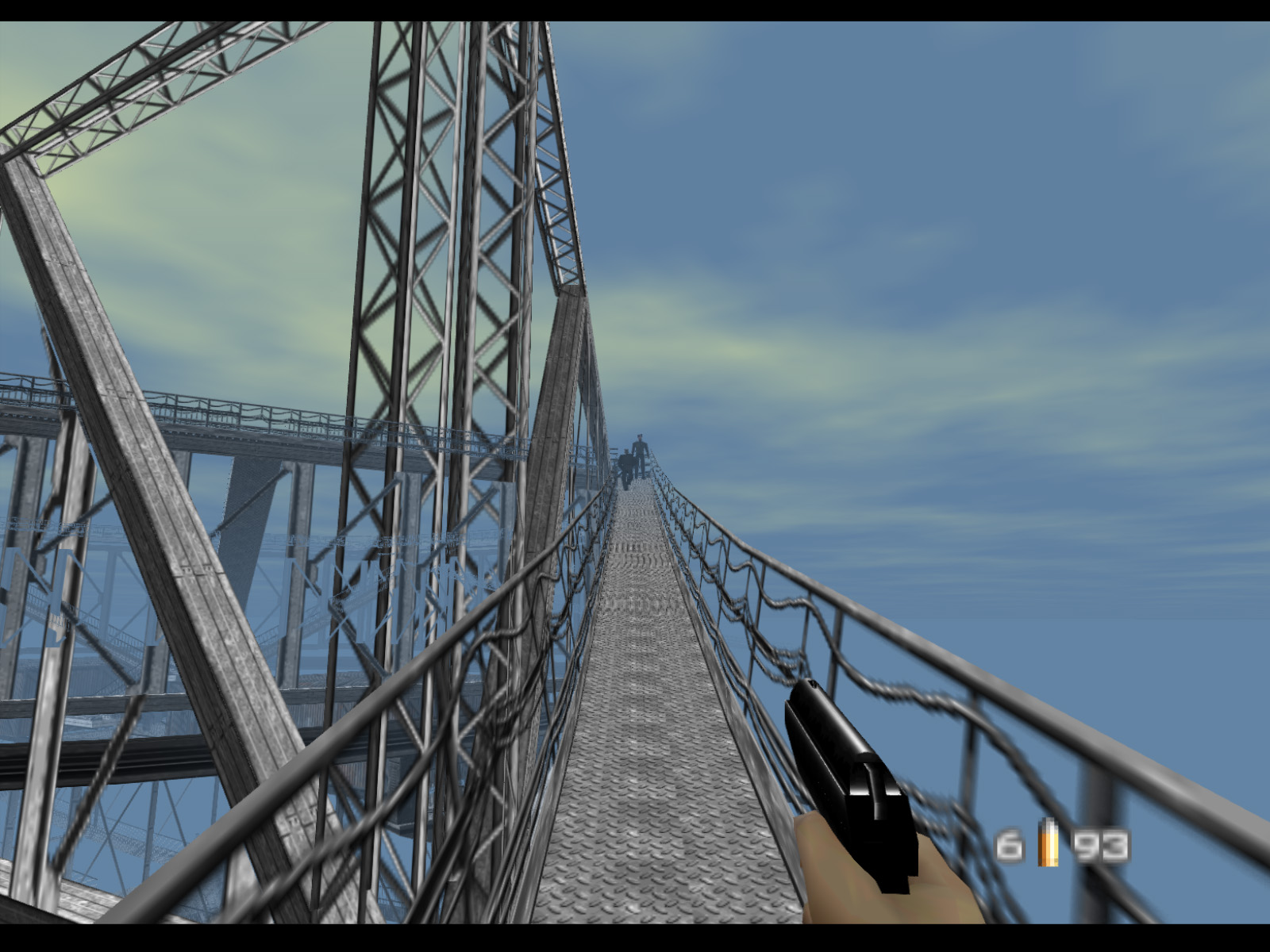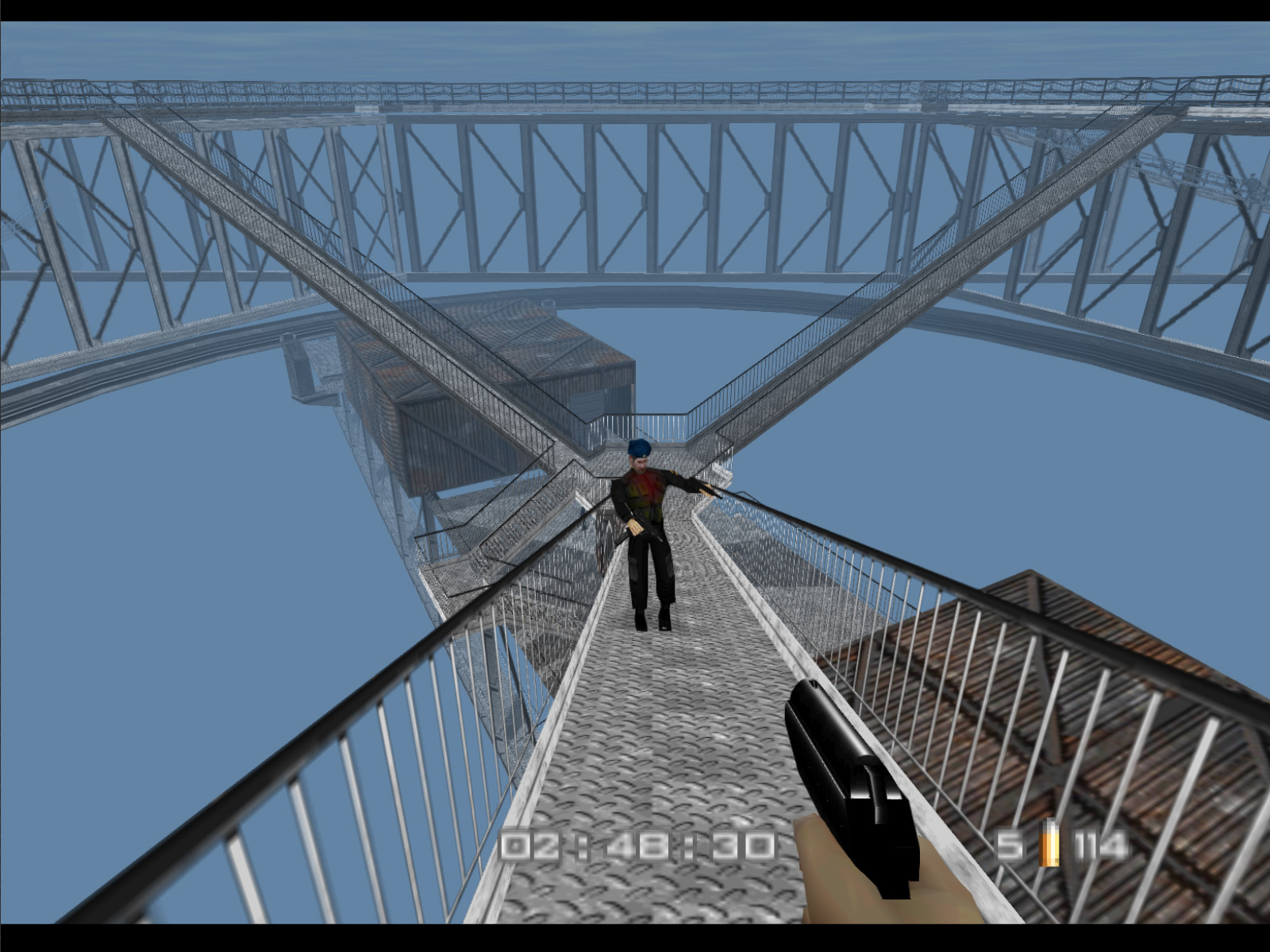 The complex observatory had to be simplified for the game. GoldenEye does not attempt to render the dish or surrounding terrain. There is only sky below the player. Even so the Nintendo 64 struggles to render the structure and frame rate suffers. In the game all three support towers are about 98.6 meters high. The distance from the center of the cradle to each support tower is about 106 meters.