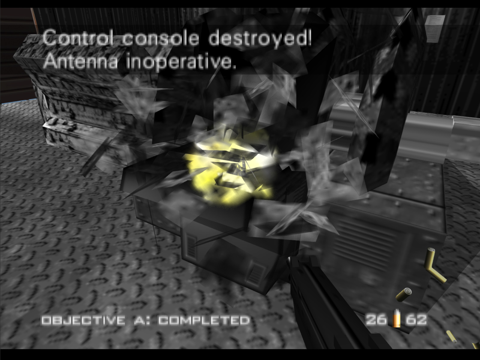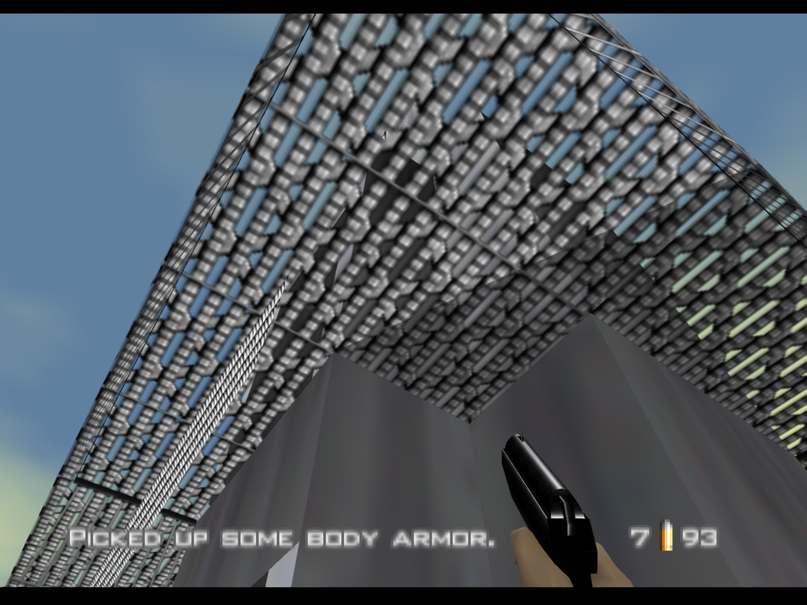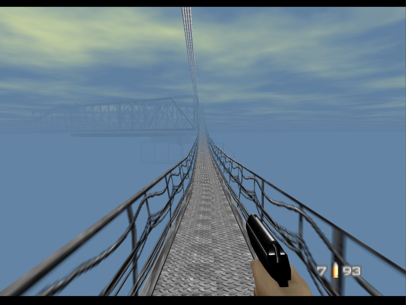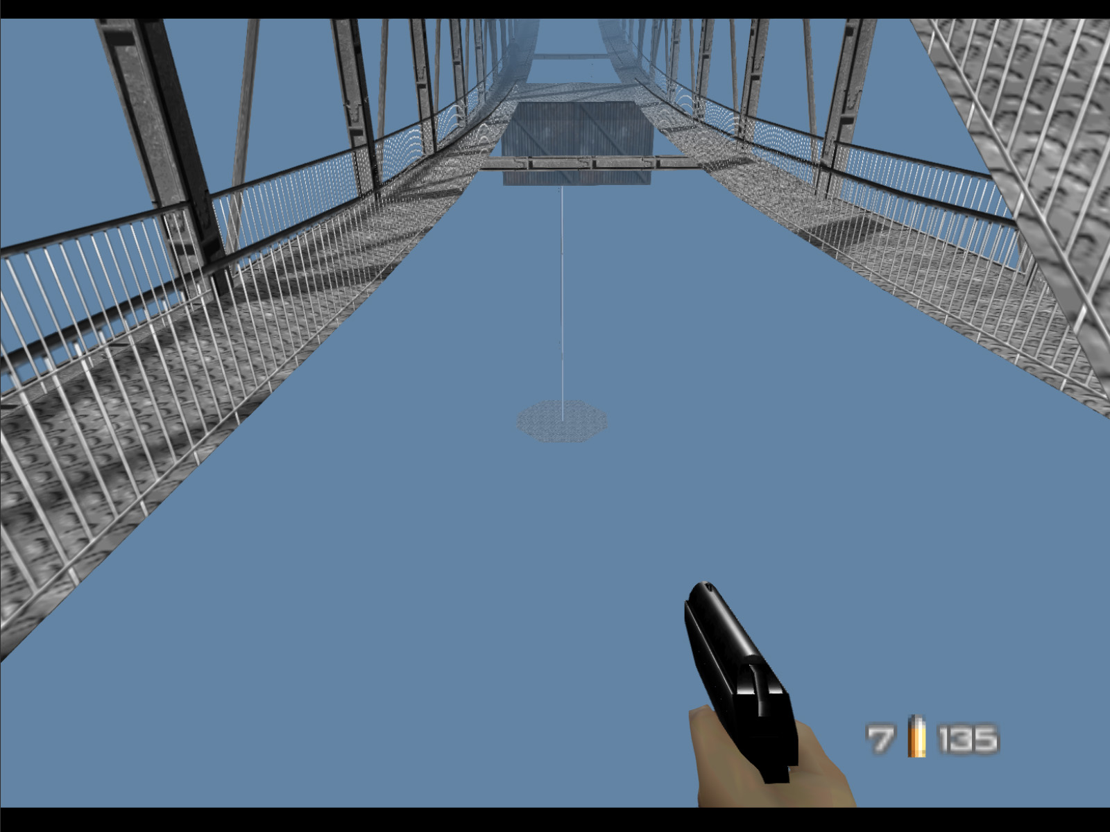 The complex observatory had to be simplified for the game. GoldenEye does not attempt to render the dish or surrounding terrain. There is only sky below the player. Even so the Nintendo 64 struggles to render the structure and frame rate suffers. In the game all three support towers are about 98.6 meters high. The distance from the center of the cradle to each support tower is about 106 meters.