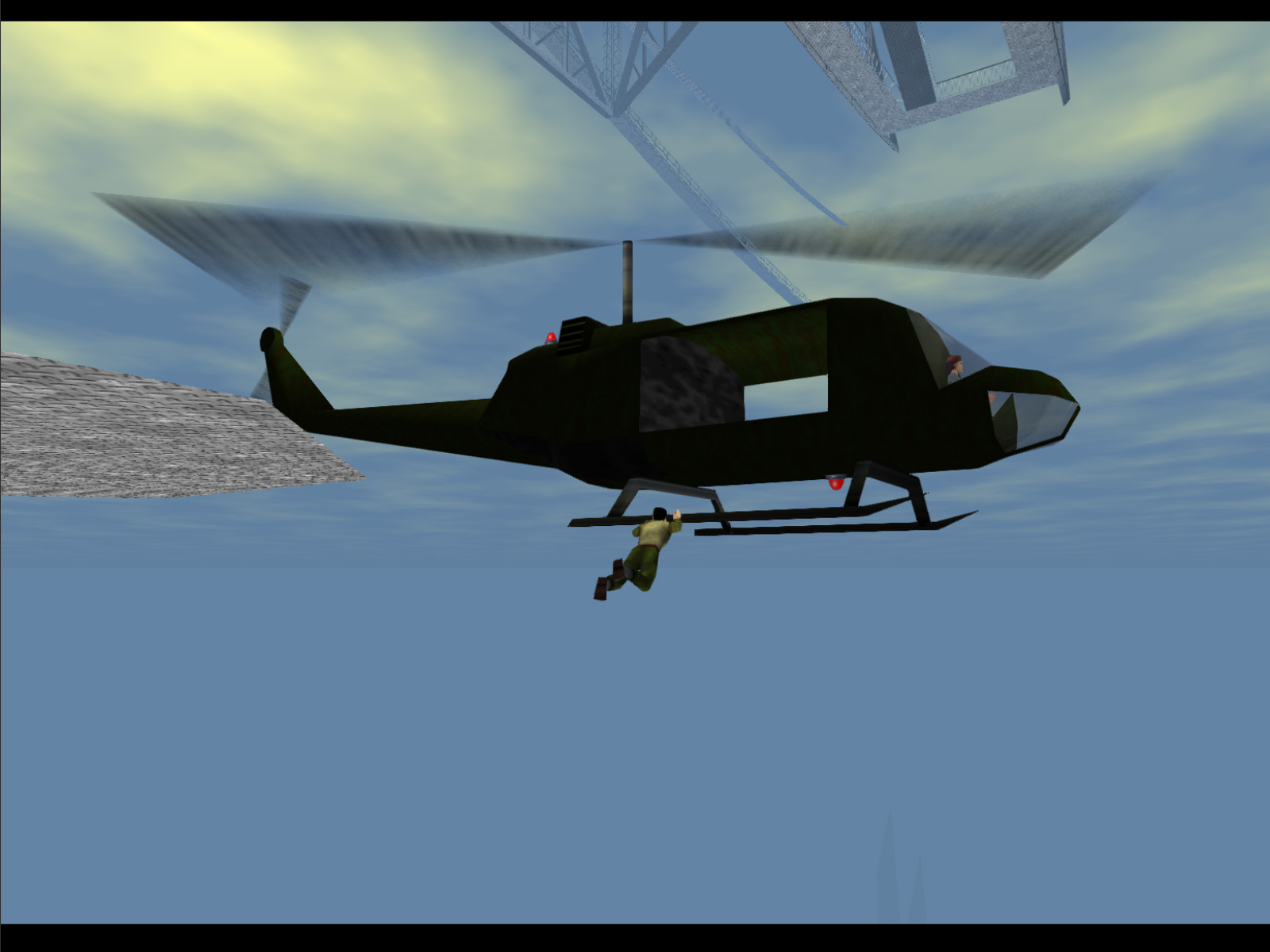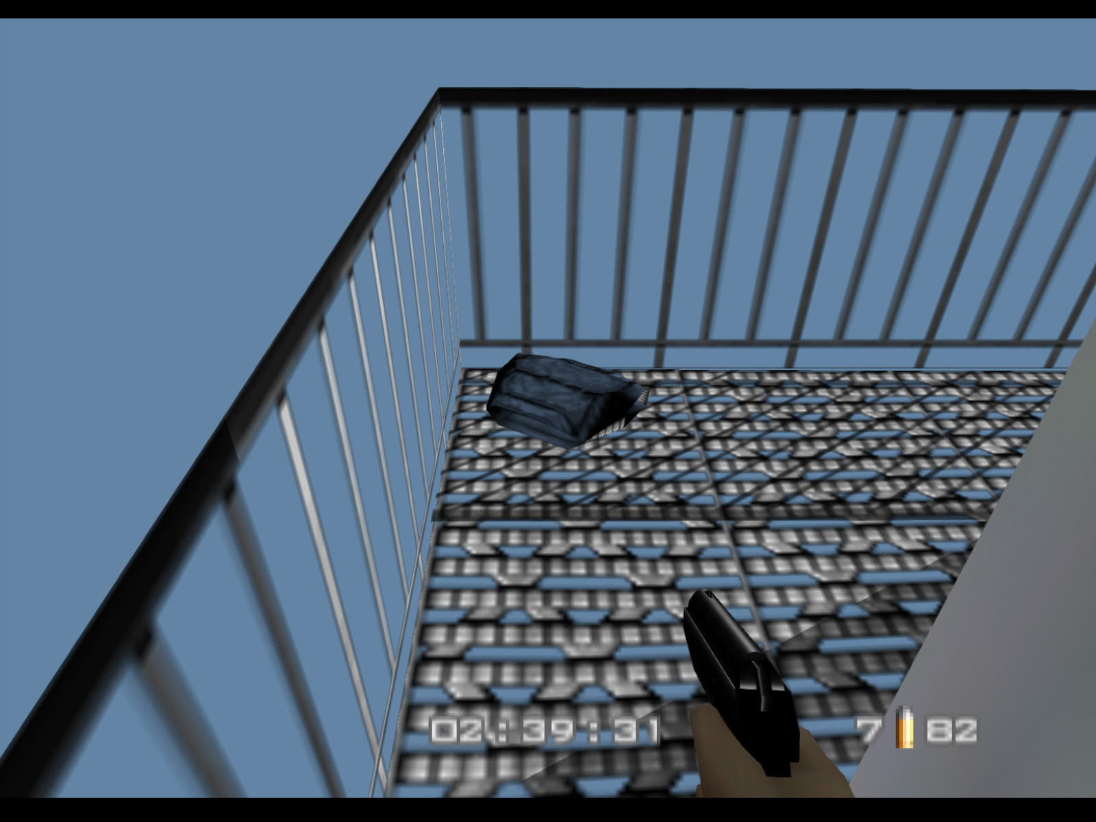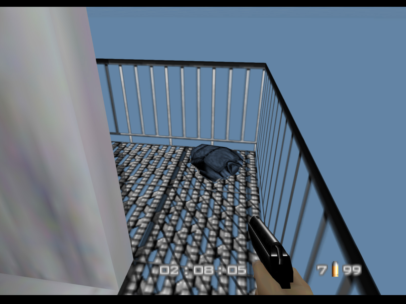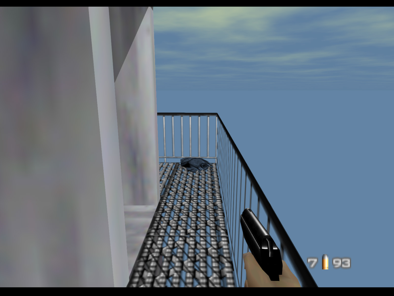 The complex observatory had to be simplified for the game. GoldenEye does not attempt to render the dish or surrounding terrain. There is only sky below the player. Even so the Nintendo 64 struggles to render the structure and frame rate suffers. In the game all three support towers are about 98.6 meters high. The distance from the center of the cradle to each support tower is about 106 meters.
