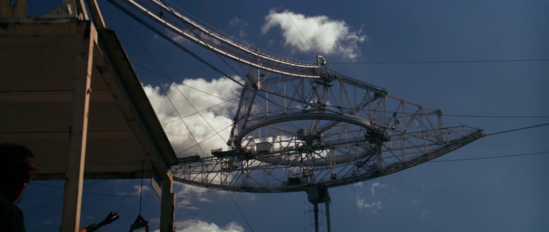 Cradle is based on the former radio telescope at the Arecibo Observatory in Puerto Rico. The telescope was built in 1963 and collapsed on December 1, 2020 due to damage from earthquakes and hurricanes as well as neglected maintenance. The telescope was suspended by three concrete towers and 18 eight centimeter diameter steel cables. One tower was 111 meters high and the other two were 81 meters high. The steerable receiver was mounted 150 meters above a 305 meter diameter spherical (not parabolic) dish made of perforated aluminum panels.