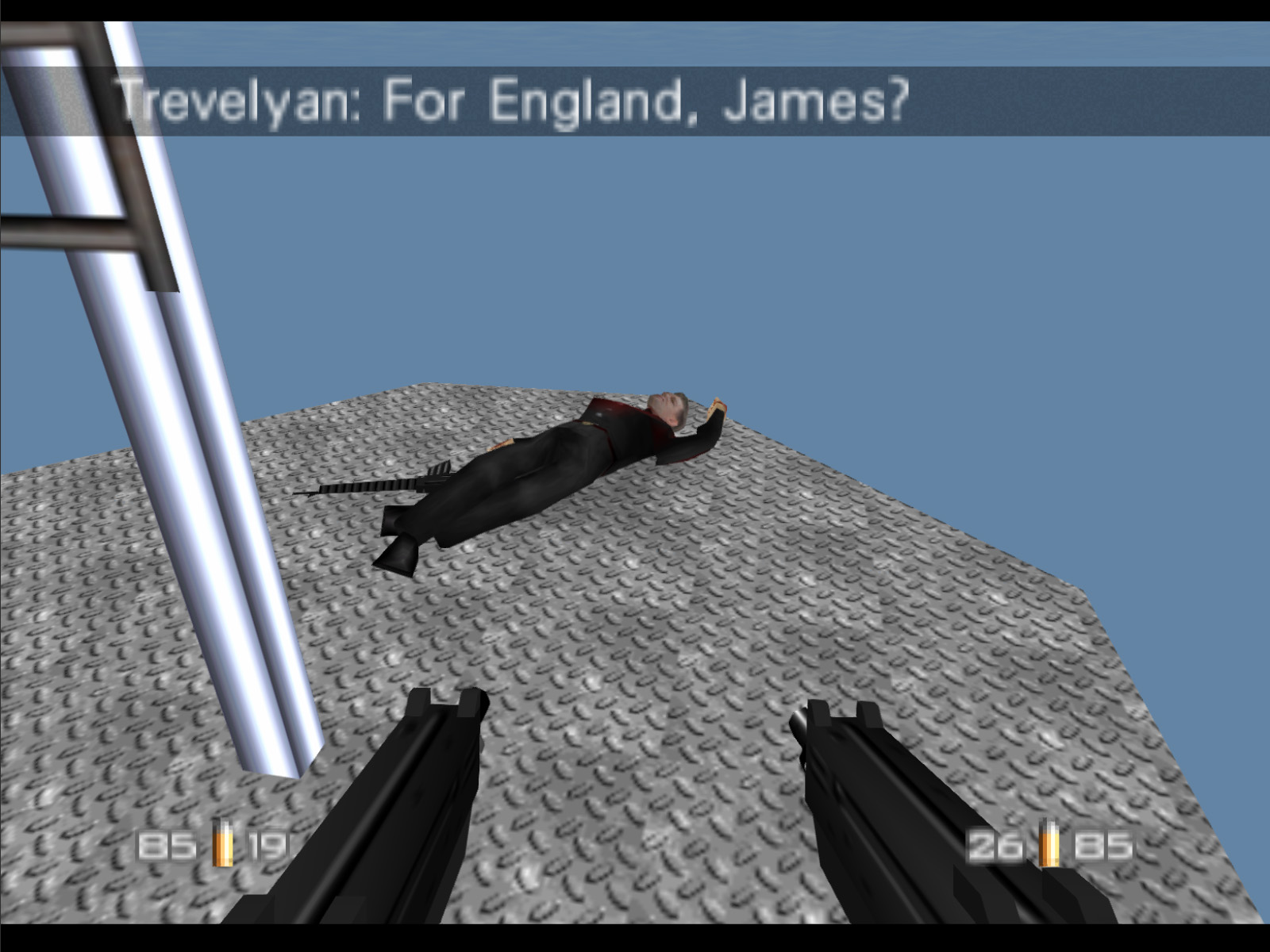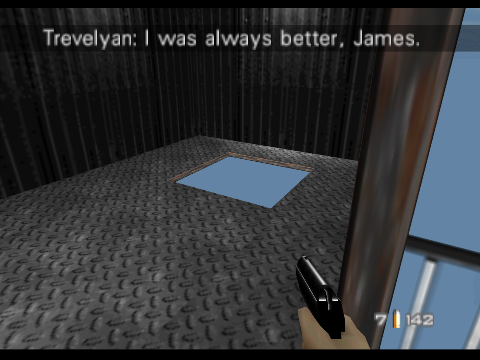 The battle with Trevelyan is the most complex in the game. Trevelyan runs between preprogrammed locations until he takes enough damage to make him retreat to a tiny platform at the bottom of the antenna. Once there the player must finish him off while being careful not to be knocked off the platform themselves.