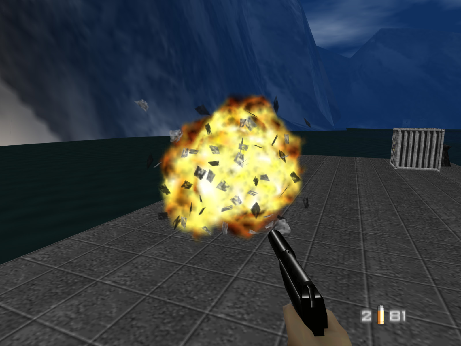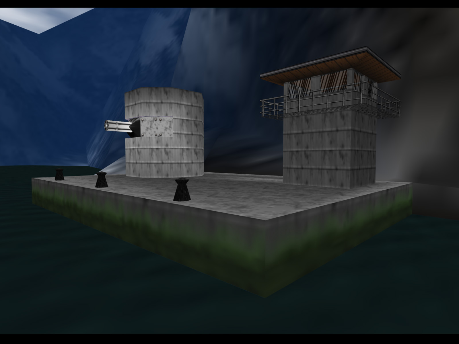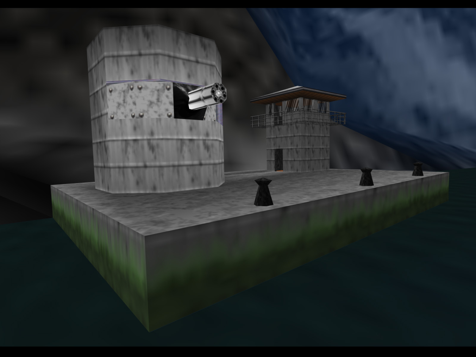 Dam's island has long been one of GoldenEye's most well-known mysteries. As soon as the game released players standing on the dam or docks noticed that two strange structures stood all the way across the reservoir. The Sniper Rifle, conveniently available in this level, gave the best look through its wobbling scope.