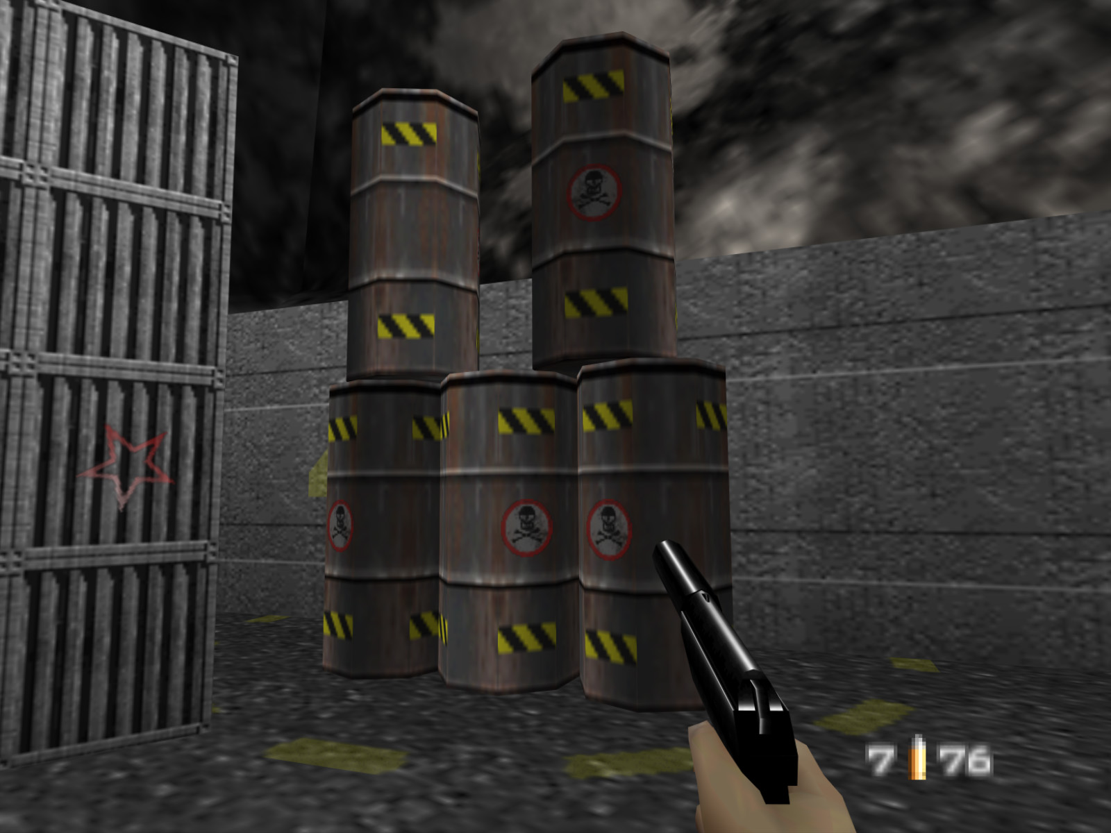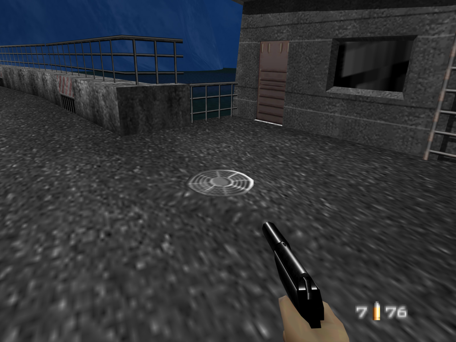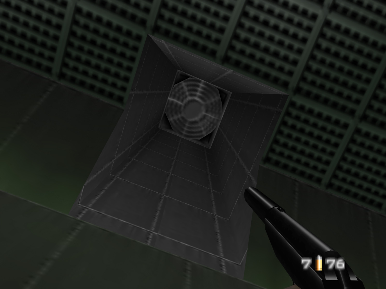 These two guards can be difficult to eliminate thanks to their cover. You can take advantage of the fact that they will never leave their pillbox. The GoldenEye engine wasn't really made for situations like this and the developers had to make some hacky structures to get this pillbox to work. If you stand in certain spots in front of the pillbox the guards cannot see you. On console it's even possible to warp through the slit by switching weapons while strafe running into it.