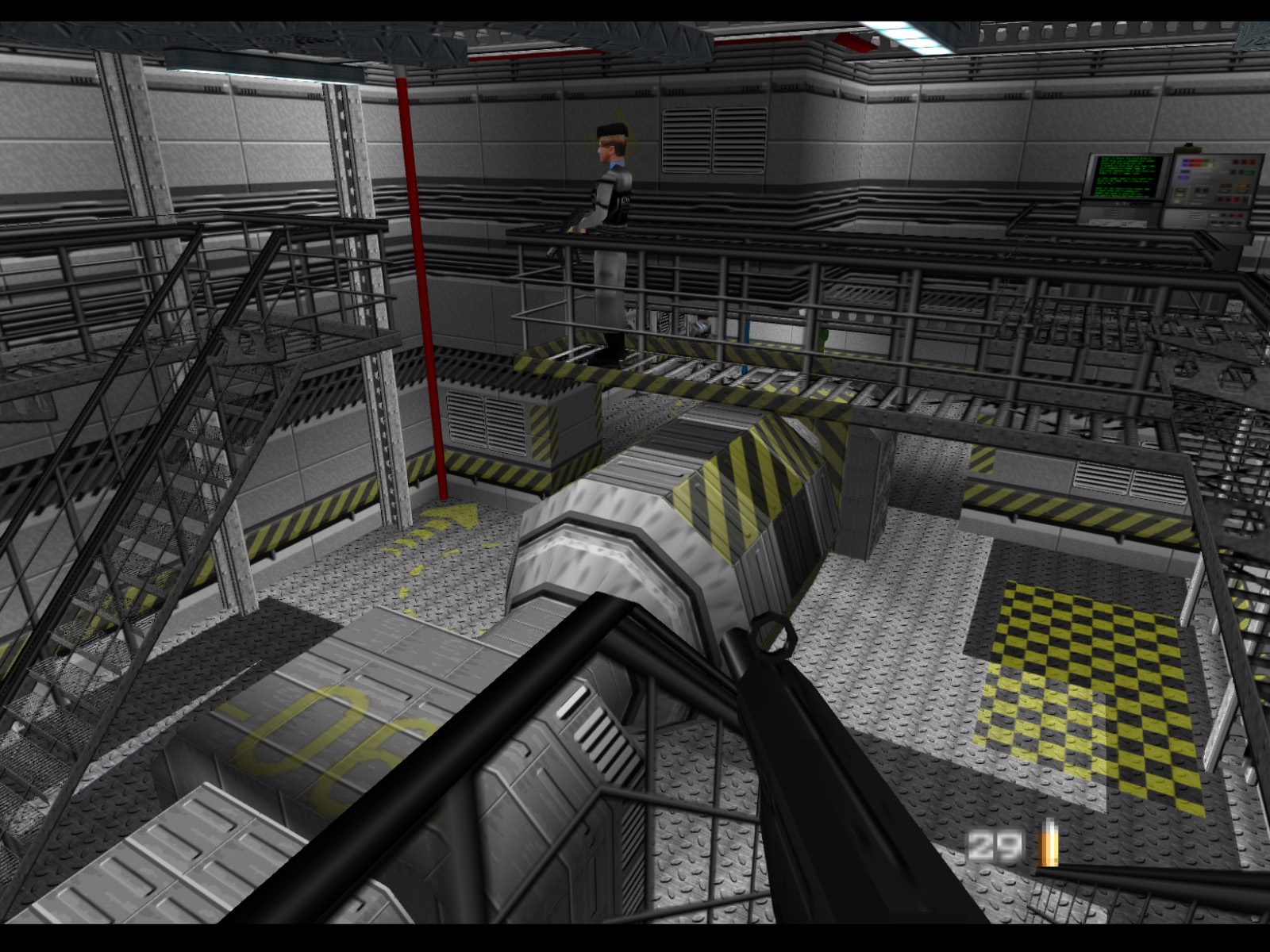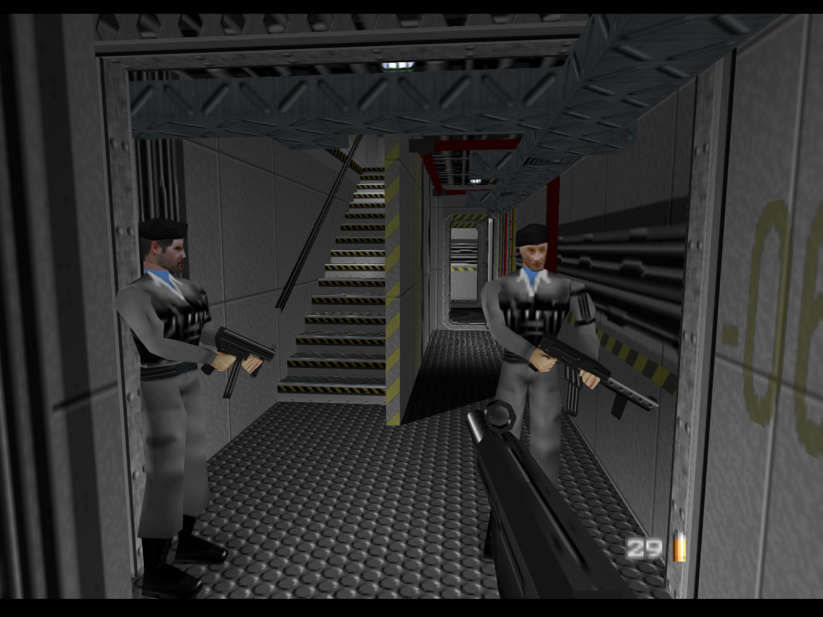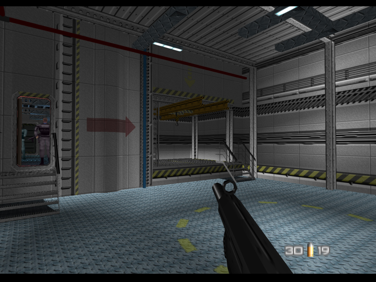 ▶ TIP: It is actually possible to shoot a Janus Marine hostage taker from here. I recommend using the PP7 for this because it is more accurate than the Silenced D5K. Of course this difficult shot is easier to make on a high resolution emulator than on original console. If you do make this shot you will free a hostage, but you should also prepare for two Janus Marines to come for you.
