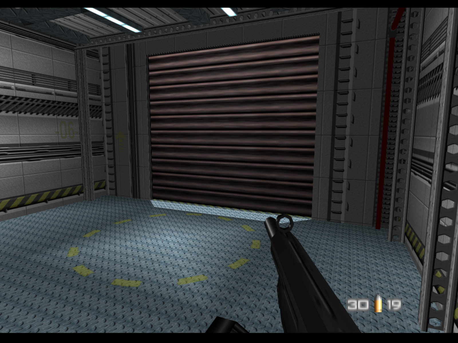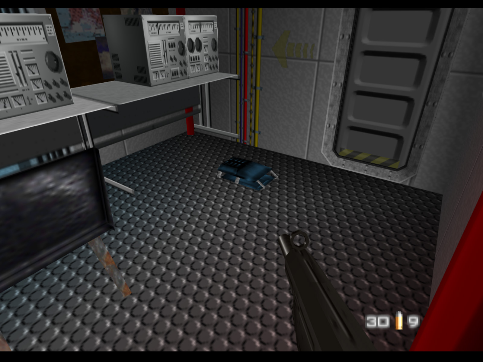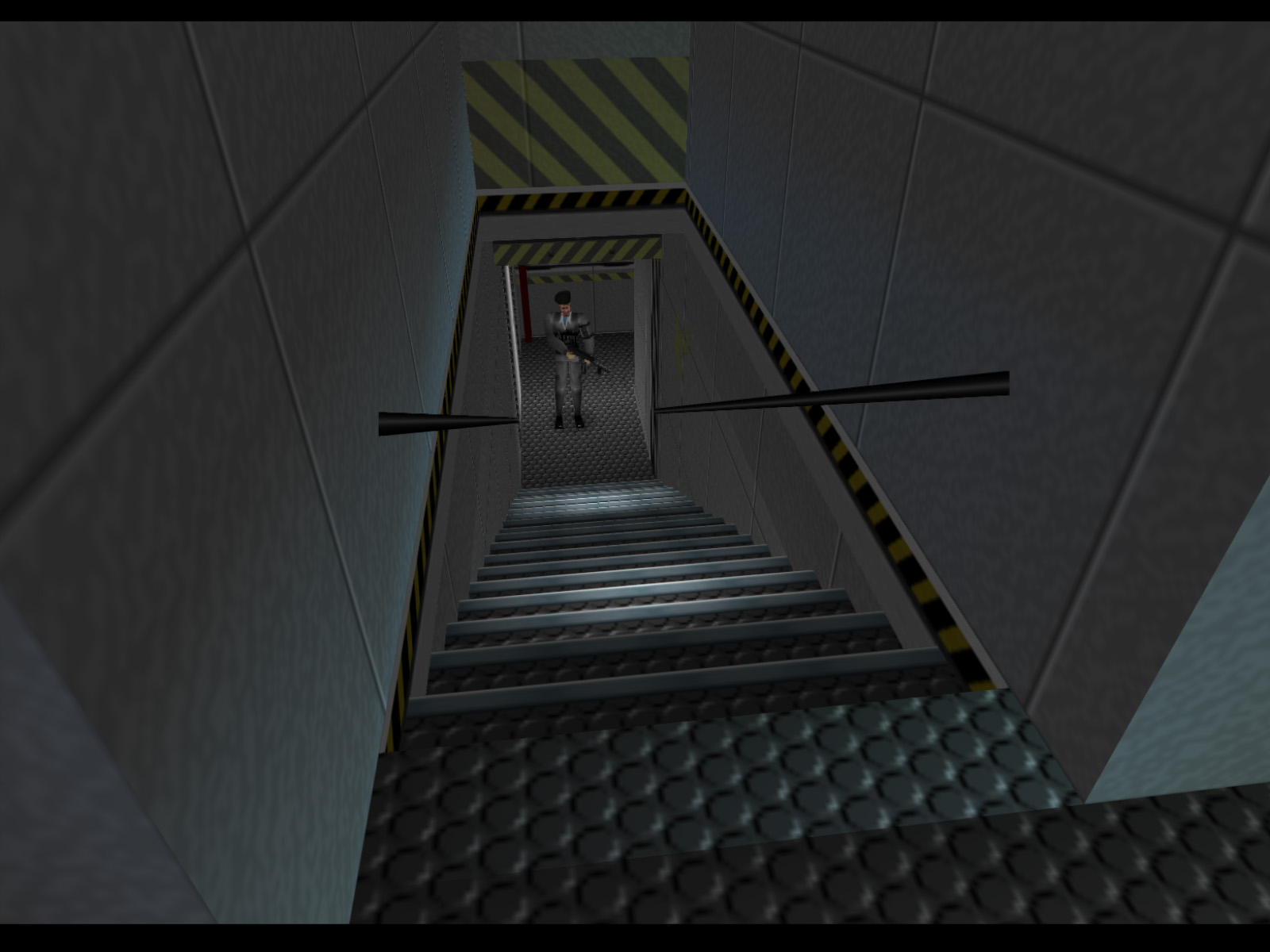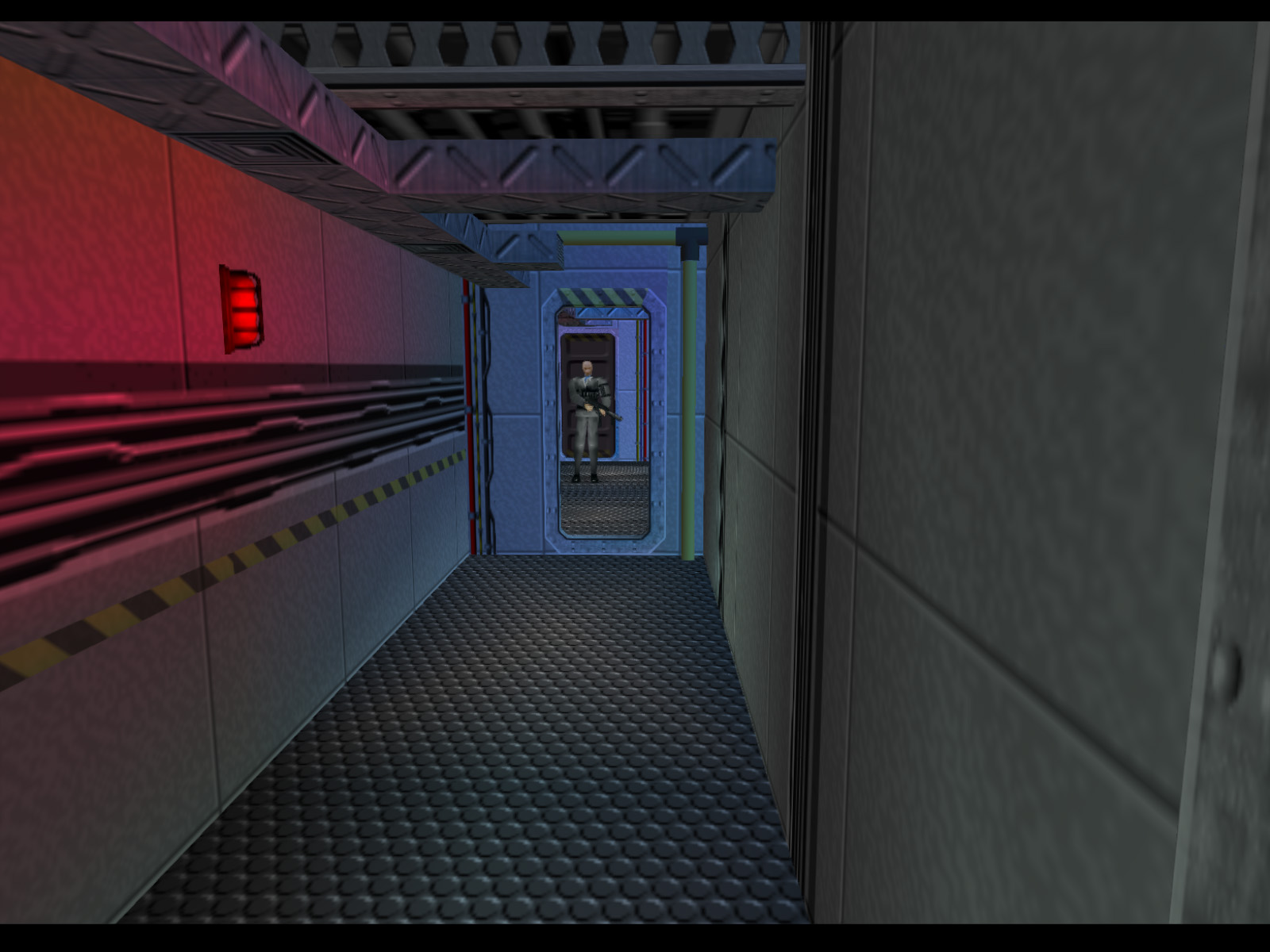 ▶ TIP: It is actually possible to shoot a Janus Marine hostage taker from here. I recommend using the PP7 for this because it is more accurate than the Silenced D5K. Of course this difficult shot is easier to make on a high resolution emulator than on original console. If you do make this shot you will free a hostage, but you should also prepare for two Janus Marines to come for you.