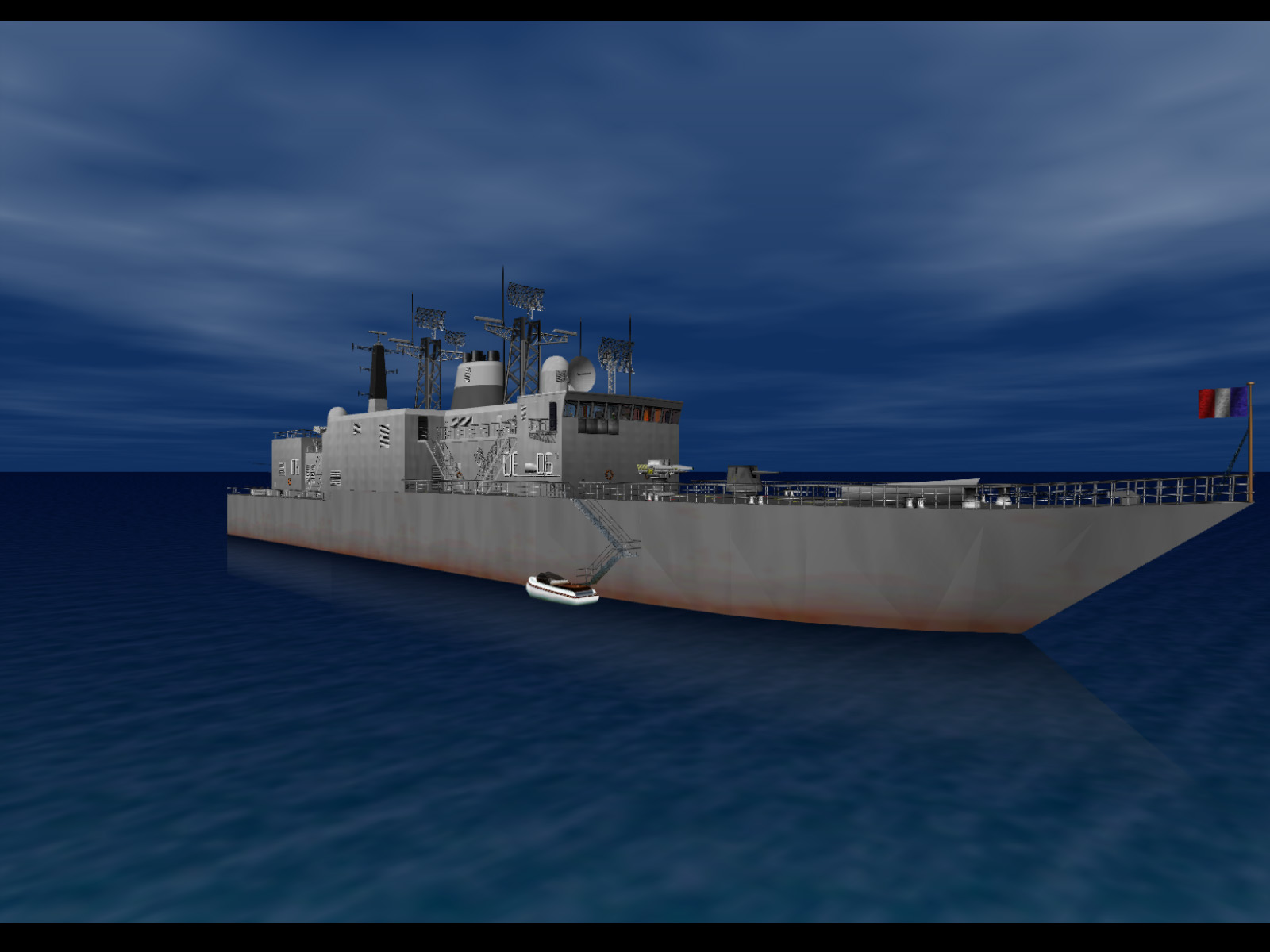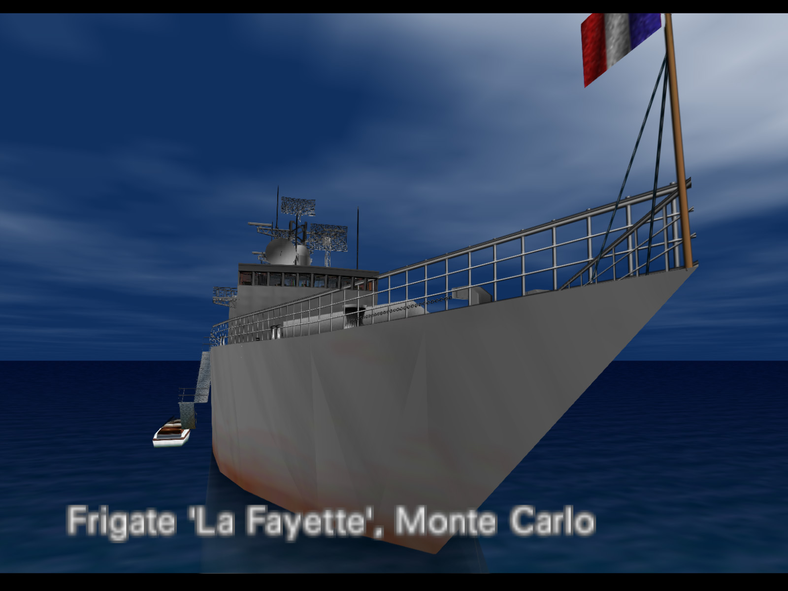 The La Fayette is a real ship which was launched in 1992 and commissioned in 1996. She was the first in the La Fayette class of frigates and 20 were made in total. She is still in service with the French navy to this day. The game's version of the ship seems to be closer in design to older military surface vessels. It lacks the angled, clean superstructure of the real La Fayette. The game's ship measures about 119 meters in length and has a beam of about 14.8 meters.