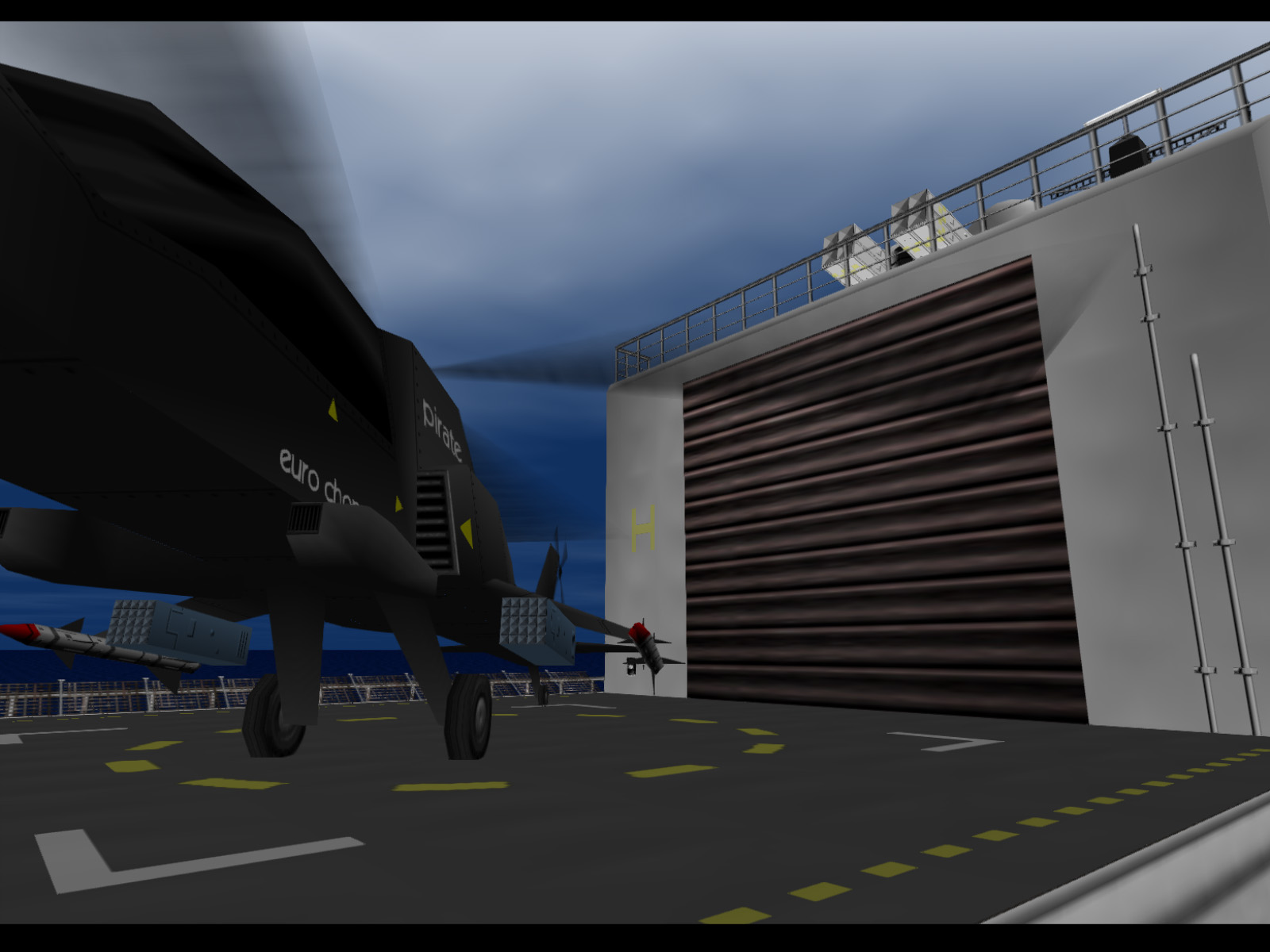 Opening the hangar door to reveal the Pirate helicopter.