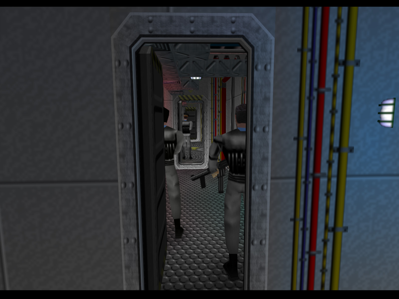 Opening the door farthest on the left in the last screenshot reveals these passageways. I opened the farther door as well to show all three guards in this area. They all faces away from the bridge, so if you come quietly from this direction, you can get the jump on them.