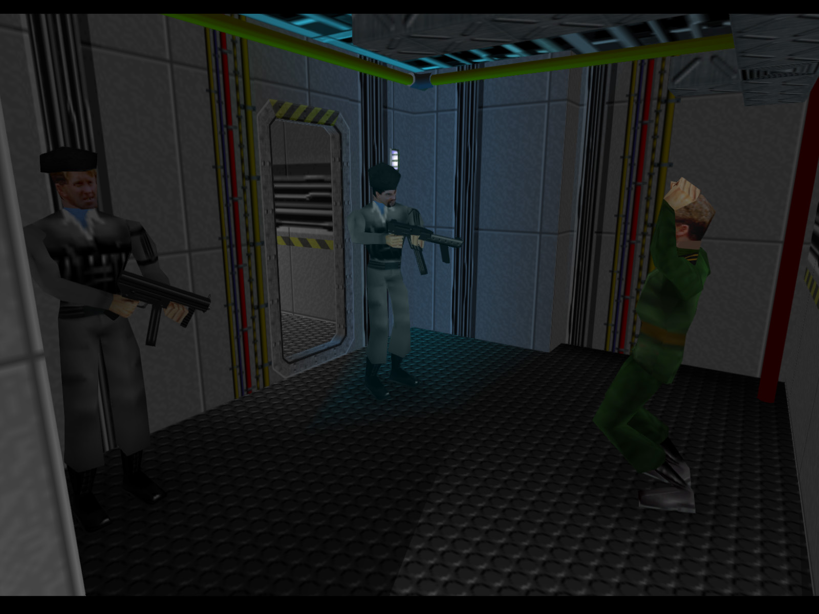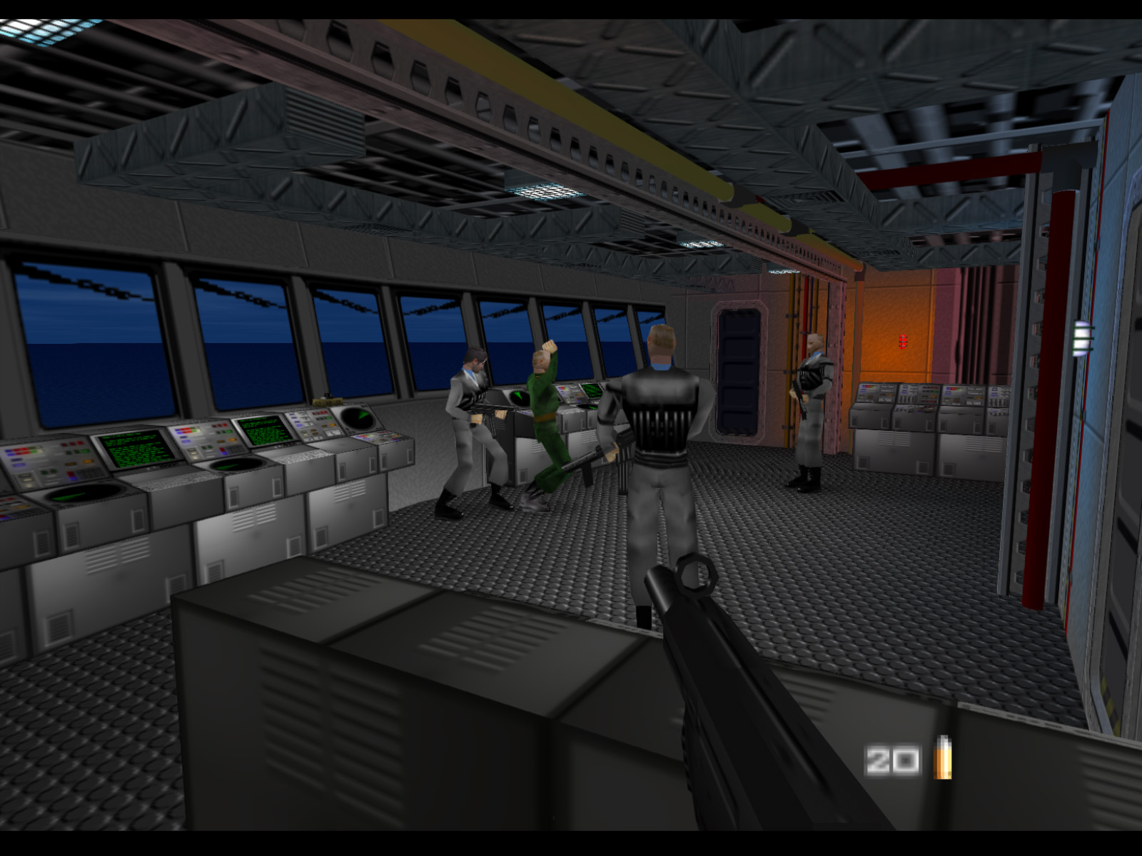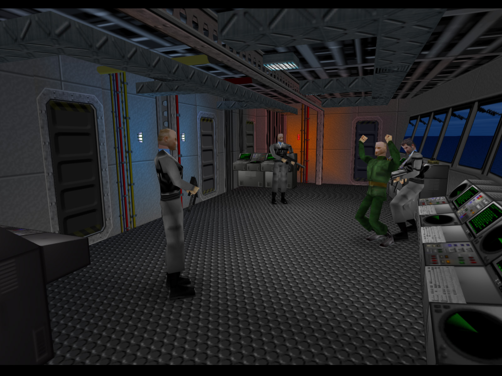 This screenshot shows the bridge as it looks by default without shooting anyone from the bow. There are three Janus Marines and one Naval Officer who is hostage.