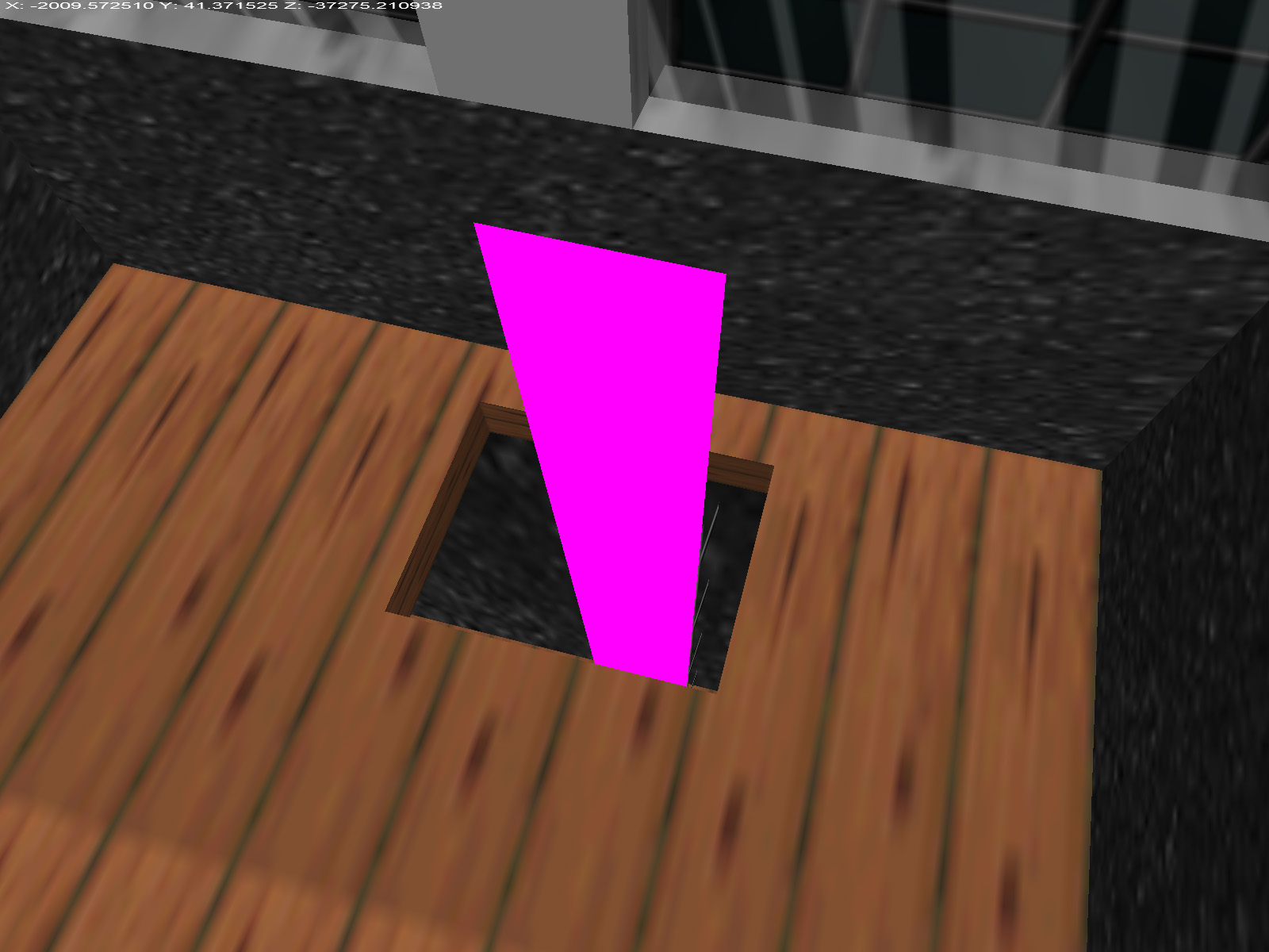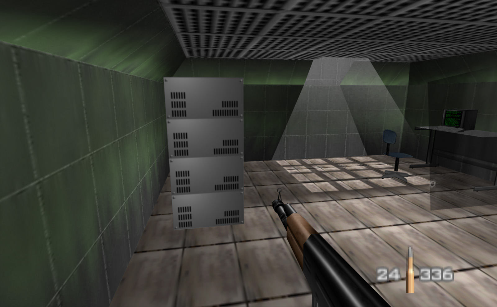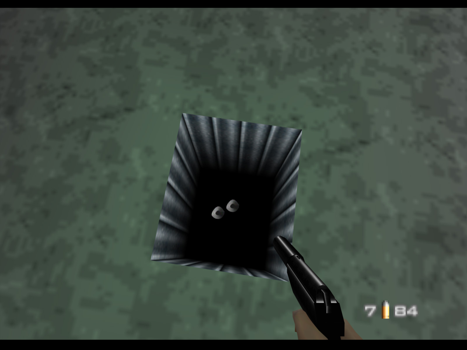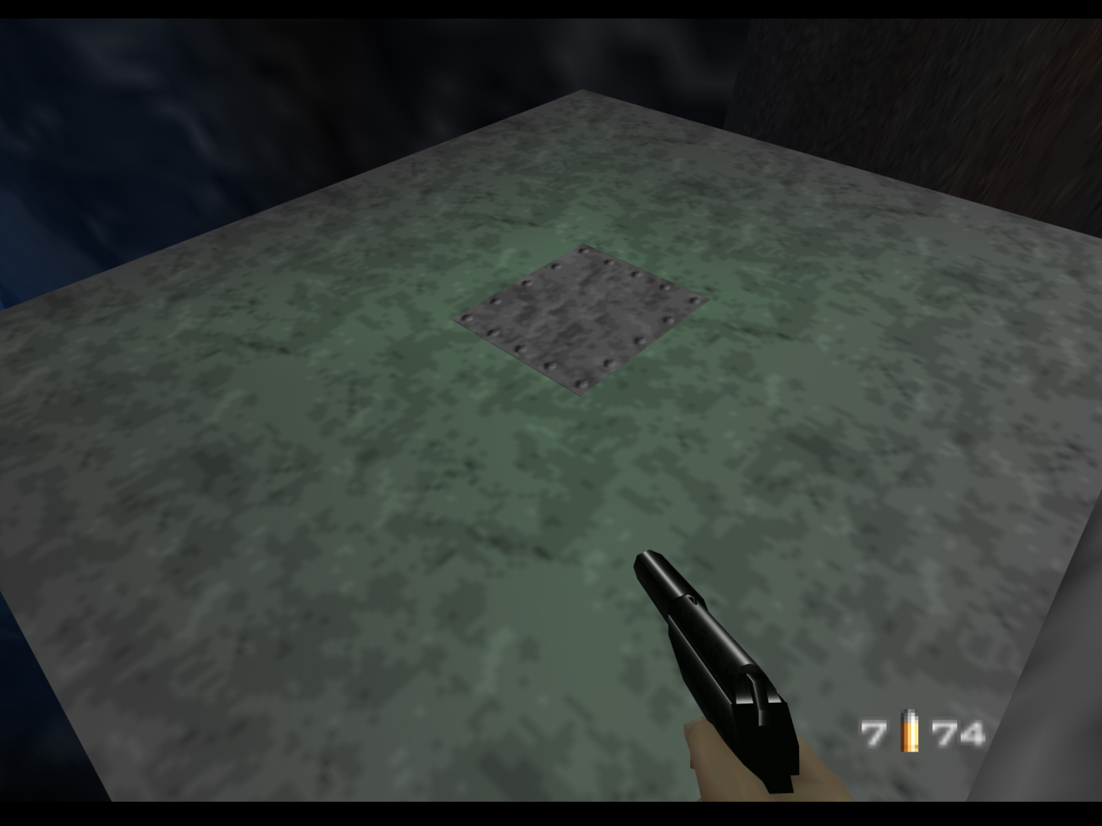 That's not all! If the hatch is removed you can see there is a shaft beneath it. I wouldn't say it goes down that deep, as you can see from the bullet holes I made, but there's probably enough room for a character to fit in if they crouched. To be clear, the hatch cover is part of the level background, not a destructible object. The game had to be modded again to remove it.