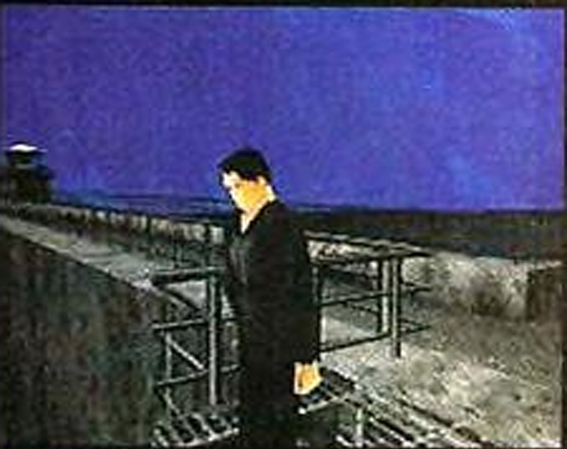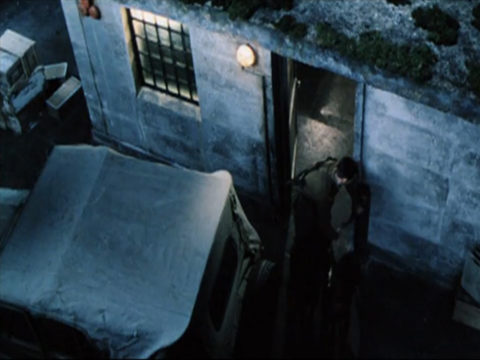 This oddly purplish image shows the guard patrolling the middle tower on the dam wearing a ushanka that's removed in the final.