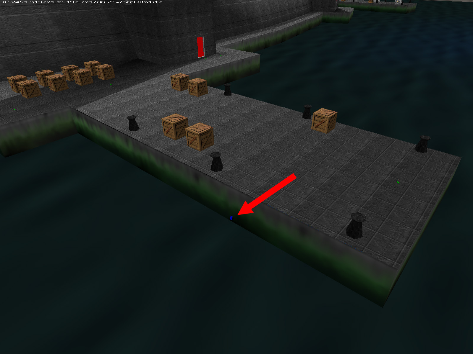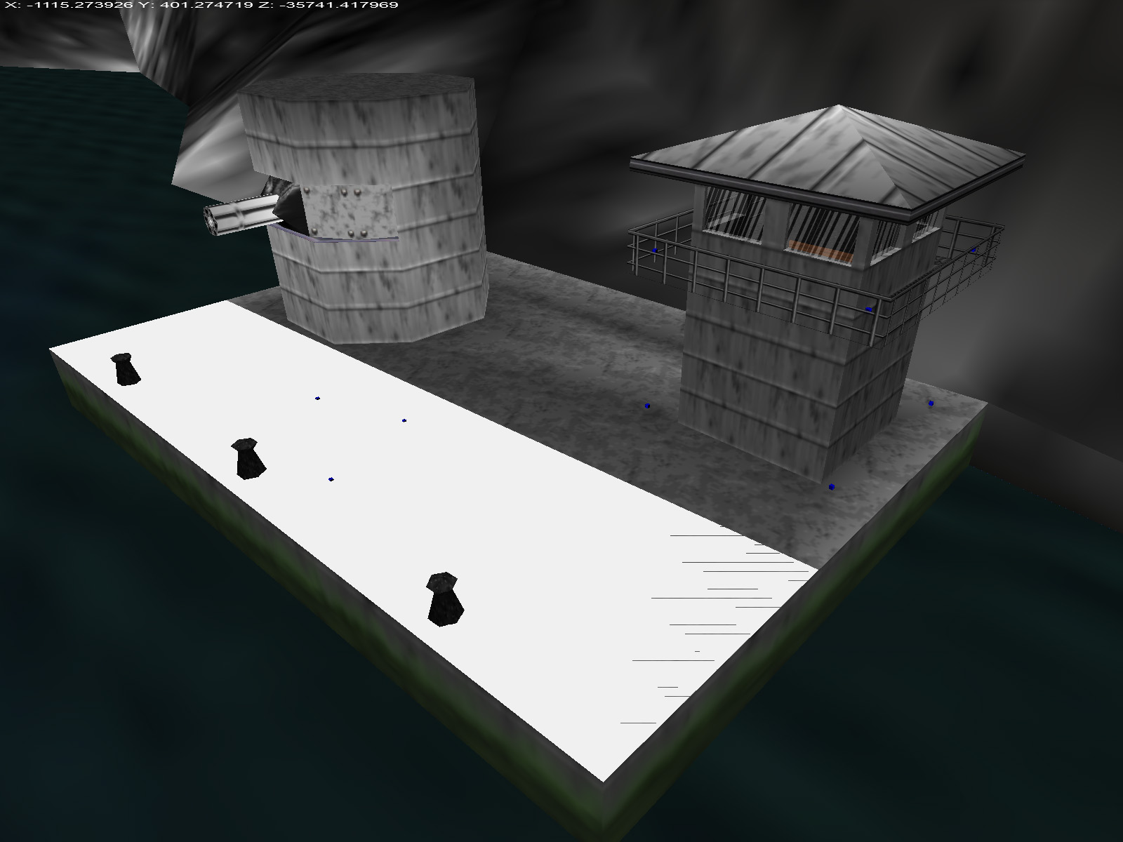 It doesn't stop with the boat model. There is an unused pad exactly where Botwood placed the boat in the original plans! The pad is seen as a tiny blue cube in this view from the GoldenEye Setup Editor. The above screenshot shows how the boat would look if placed at this pad. Note: I did scale up the model because it is fairly small.