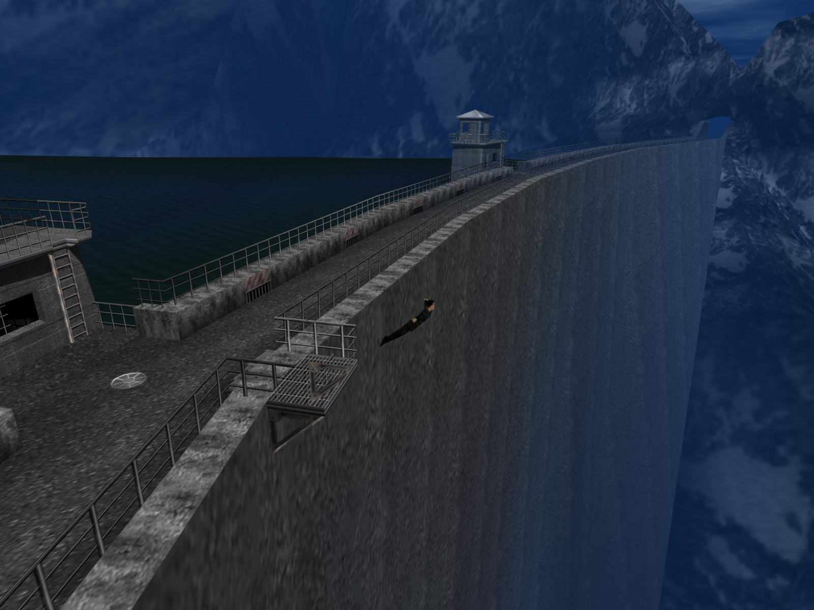 The bungee jump could have gone down three ways. It could have been completely automatic and in first person. Perhaps the player would use the bungee equipment at the top platform then the game would take control. The player would be moved off the platform, fall down the dam, pull out the piton gun, grapple the bottom platform, land, cut open the hatch with the piton gun's attached laser, and finally jump down the hatch where the level would fade out. That would have been a heck of a lot of work to script in.
