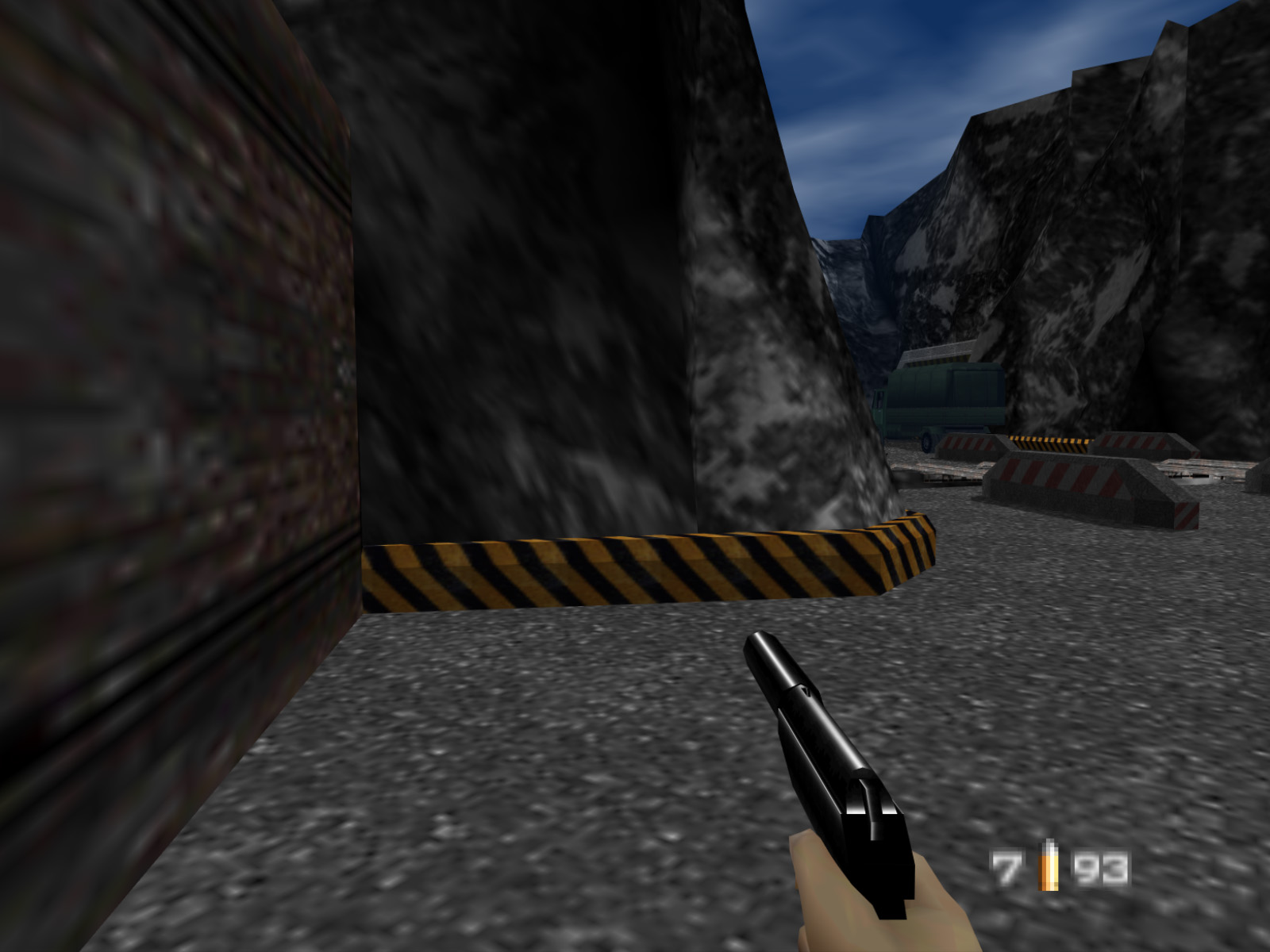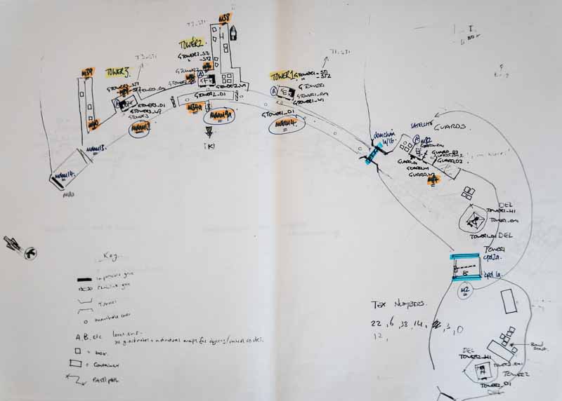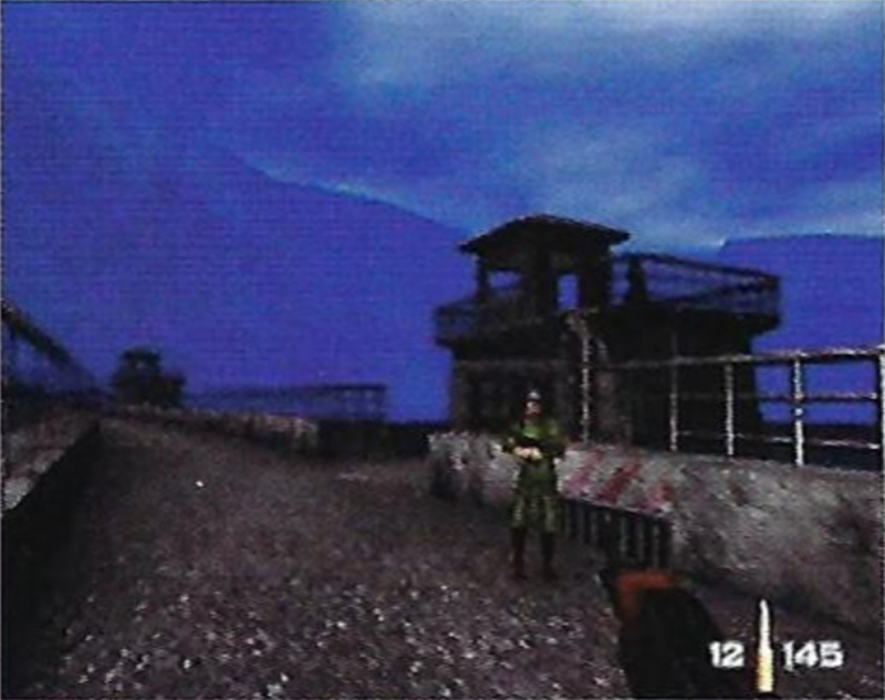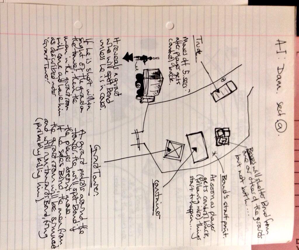 The gist of these notes is that Bond's start location would not be safe. The player would either be spotted when the truck moved or when the guard patrolling the tower saw Bond. The final game is much more forgiving and provides the player with a safe place to stand at the start.