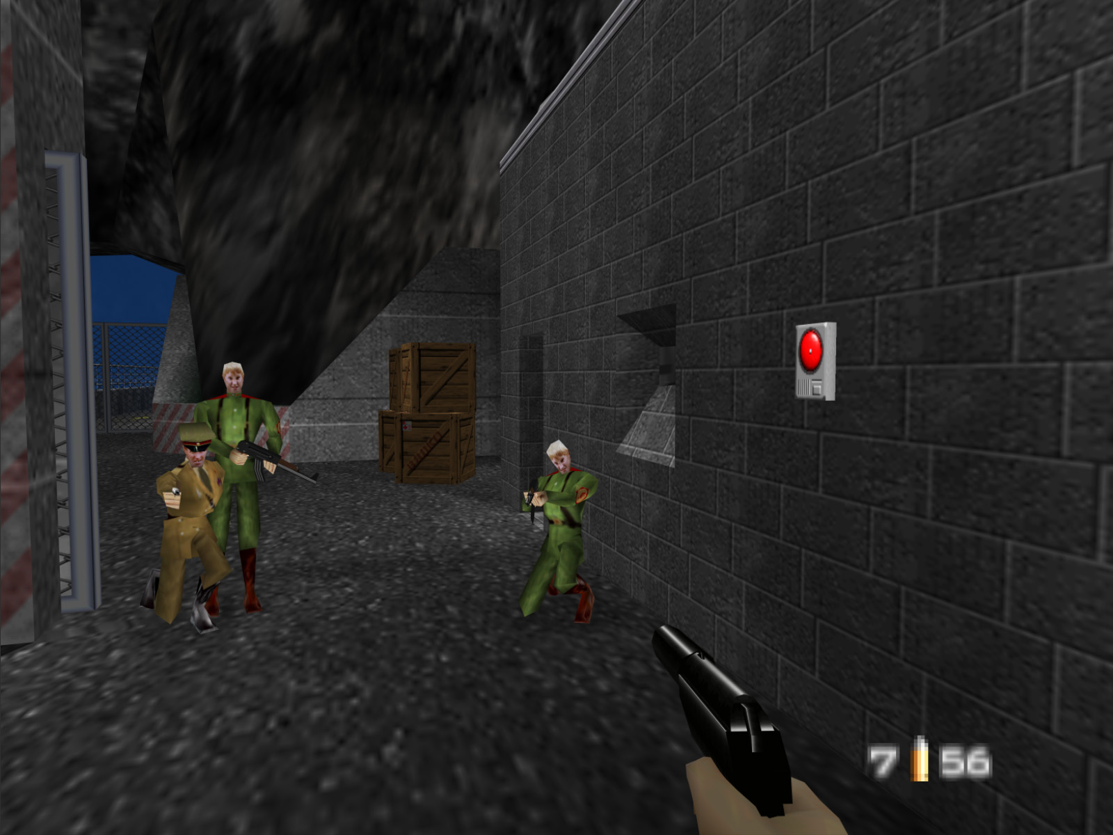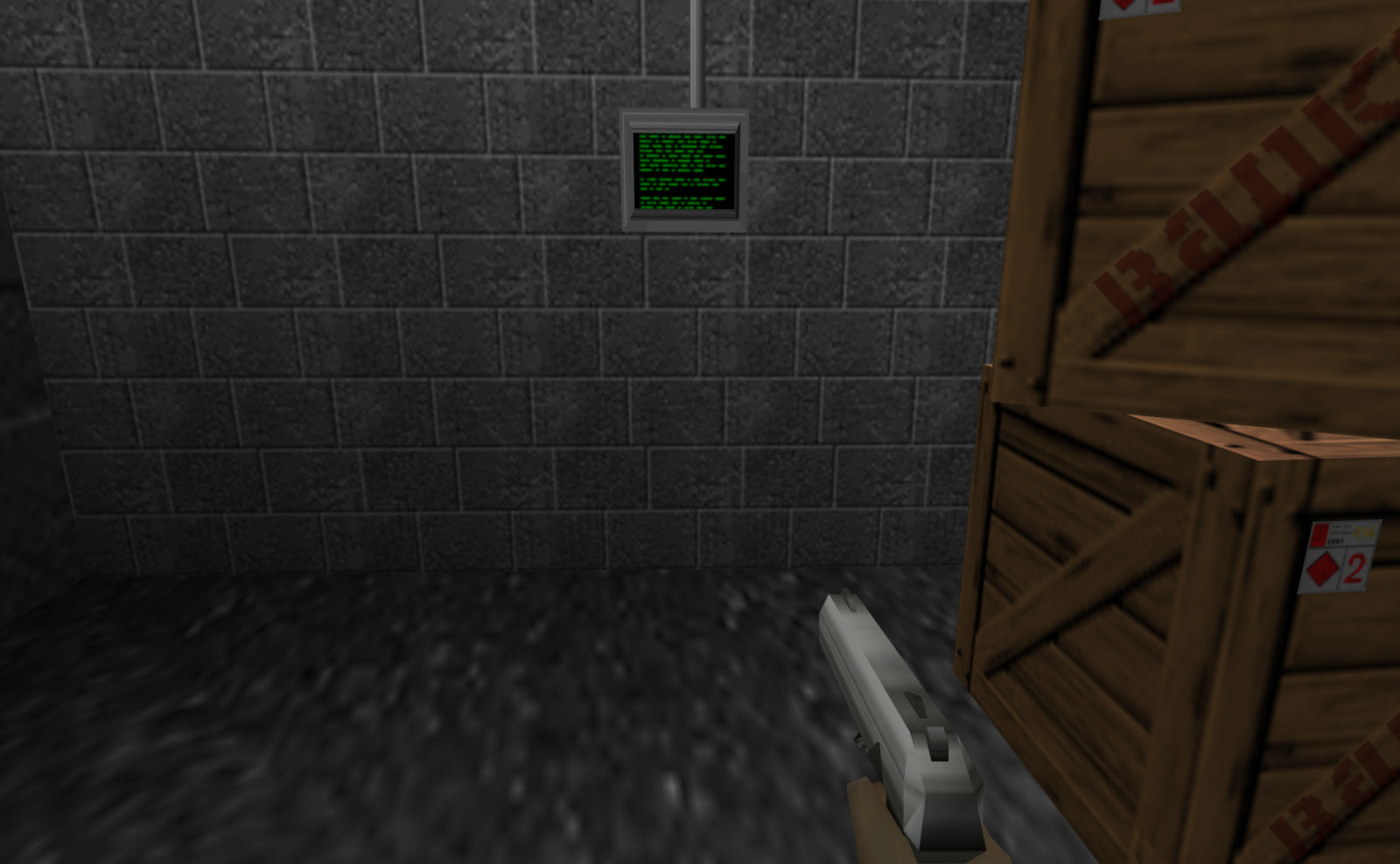 Crates were added near the uplink box. The window glass seems to be missing in prerelease, but it could just be that the player shot it out. Ignore the grate below the window missing in the final shot — that's just an emulation problem.