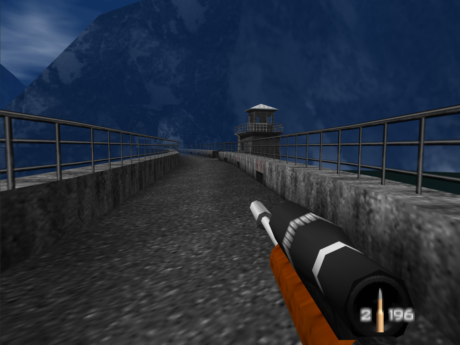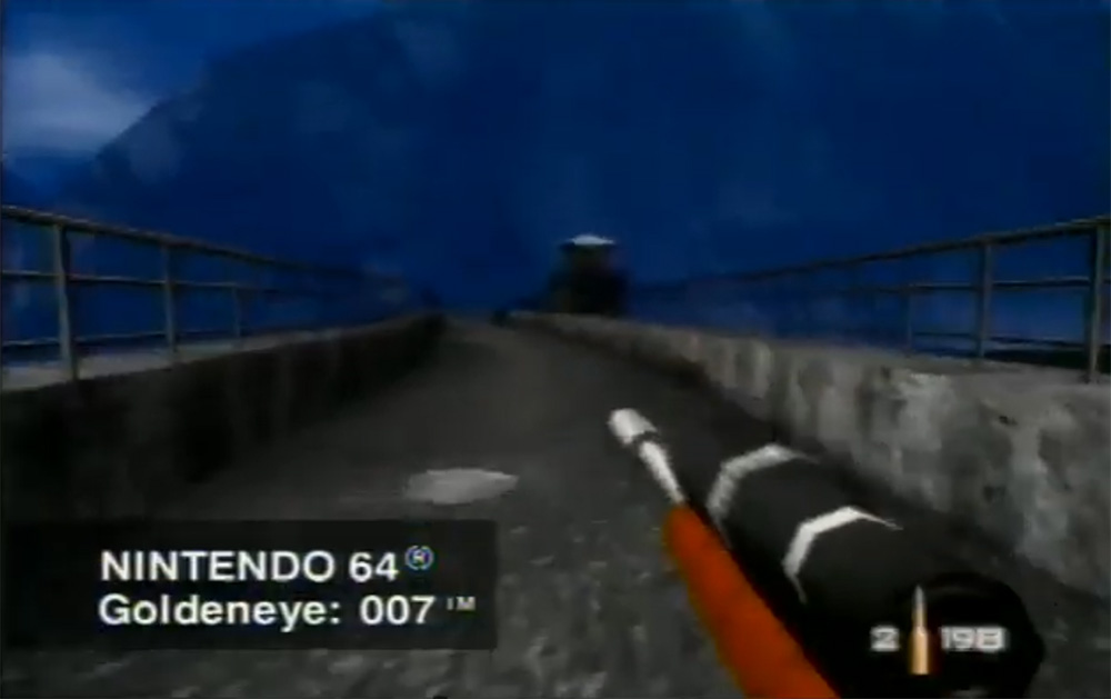 The GoldenEye movie begins with a captivating scene where Bond bungee jumps off an enormous dam. As Bond descends he pulls out a piton gun — basically a device that shoots out a small grappling hook — and then shoots that hook into a platform at the bottom of the dam. Once the grappling hook takes hold Bond reels himself in. The developers of GoldenEye the game seem to have had some ideas to recreate that scene.