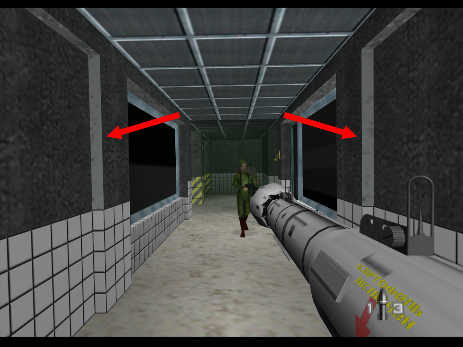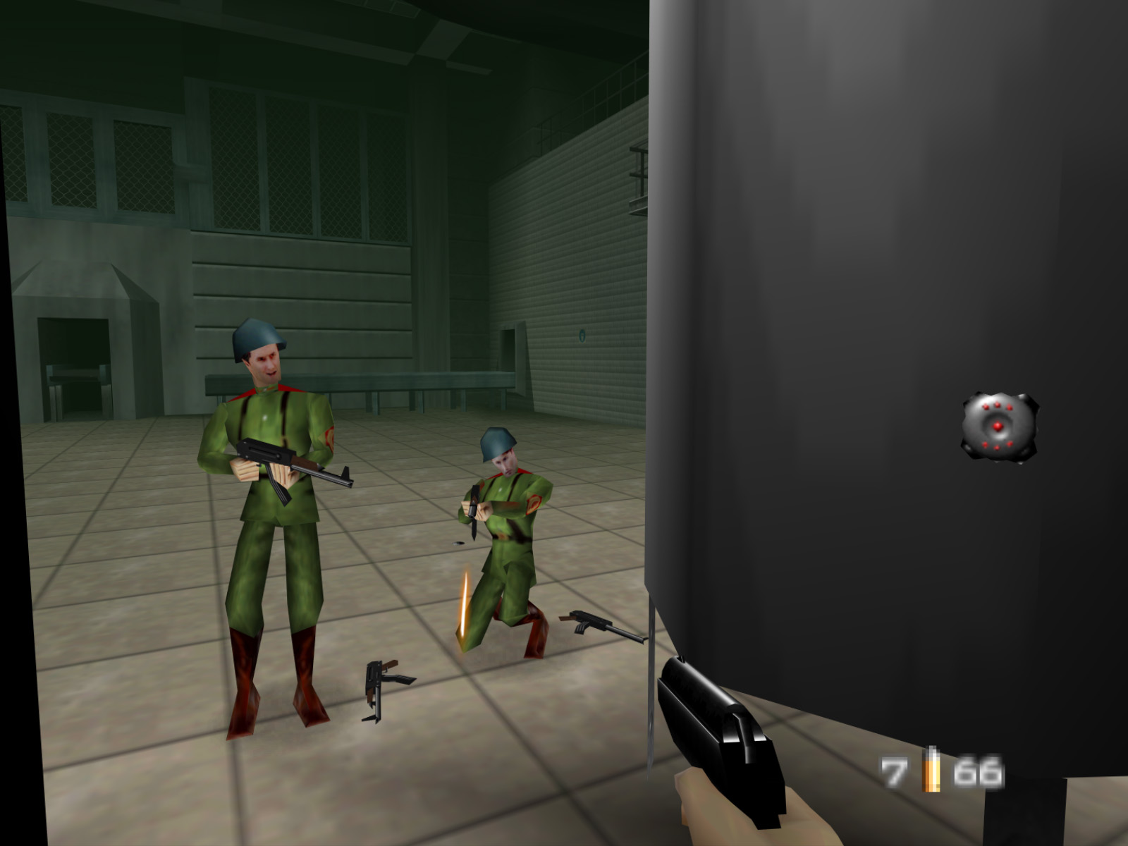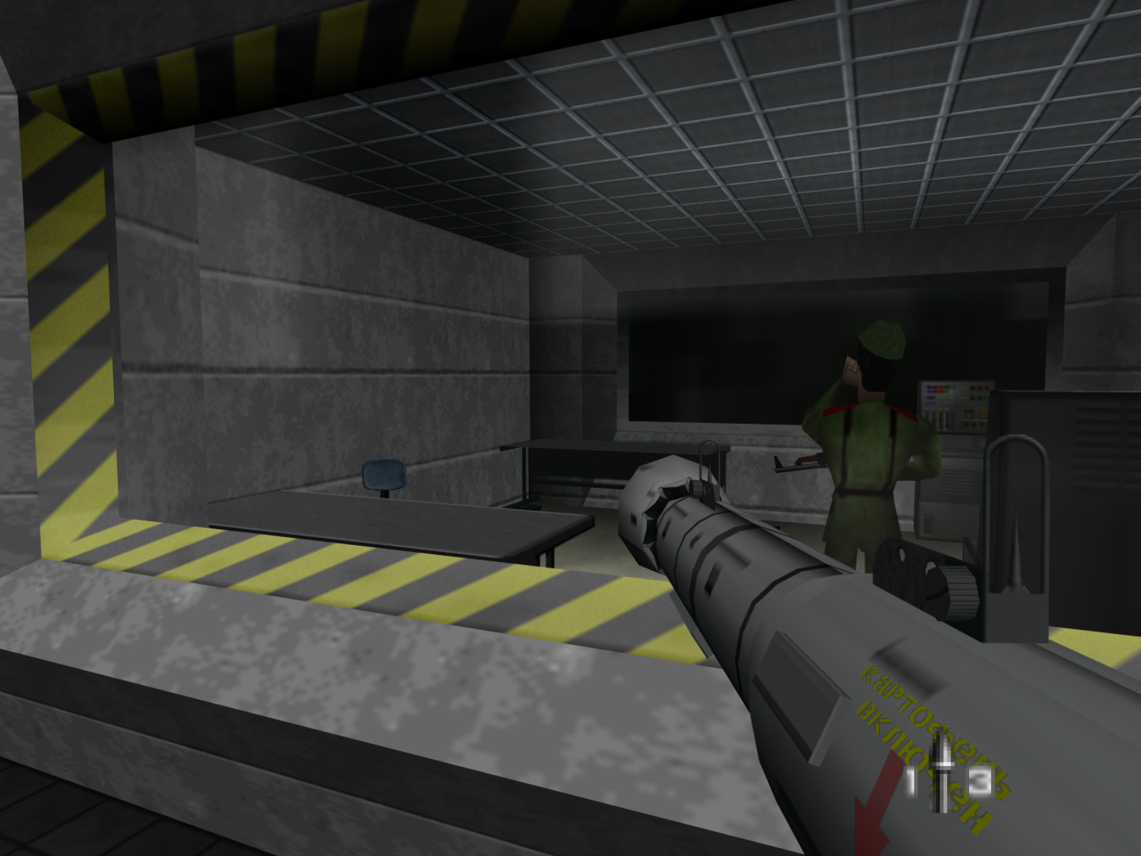 Objects such as the desks, chair, and glass are missing. Hazard stripes had not be added to the window frame yet. We also see the level used Russian Infantry instead of Russian Soldiers. The guards in the security room wore helmets instead of pilotka hats. The guards are in different positions than the final game and also two of them run out of the room upon "seeing" Bond in the released game. I think it's likely that at this stage in development the real Dr. Doak had not yet worked much of his scripting magic on Facility.