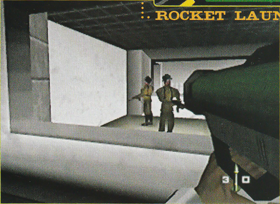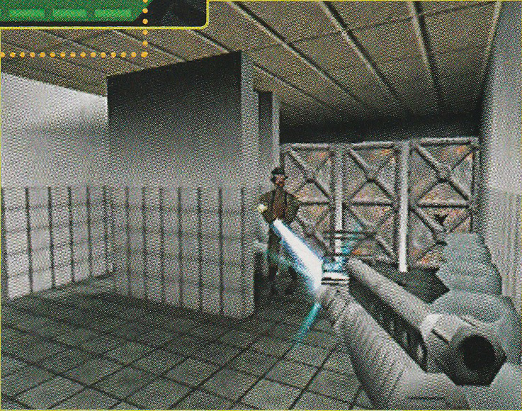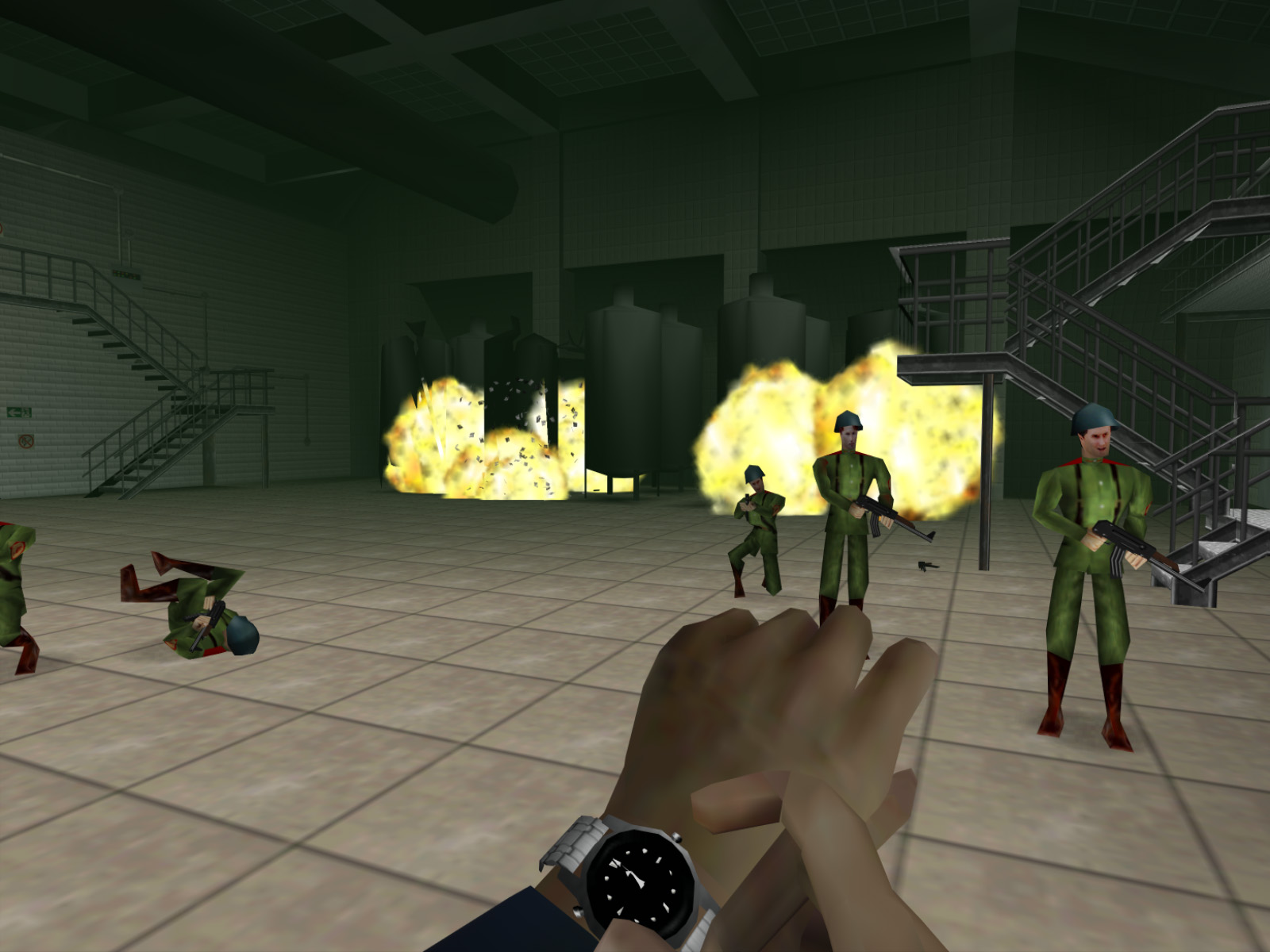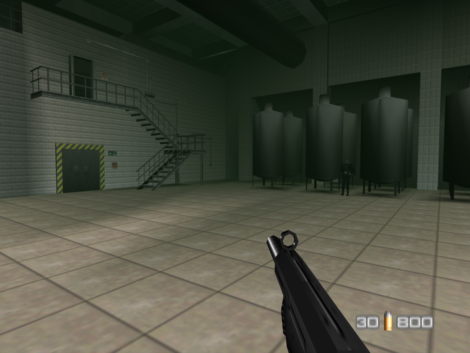 One of the tanks was given yellow vertex colors to add a bit of color to a very gray level. There is also a Scientist standing where none does in the final. It seems that in this version of GoldenEye the Scientists did not yet work at their terminals. In fact the terminals don't seem to be there at all. You can just barely see one on the far left of the final screenshot while the prerelease one lacks it.