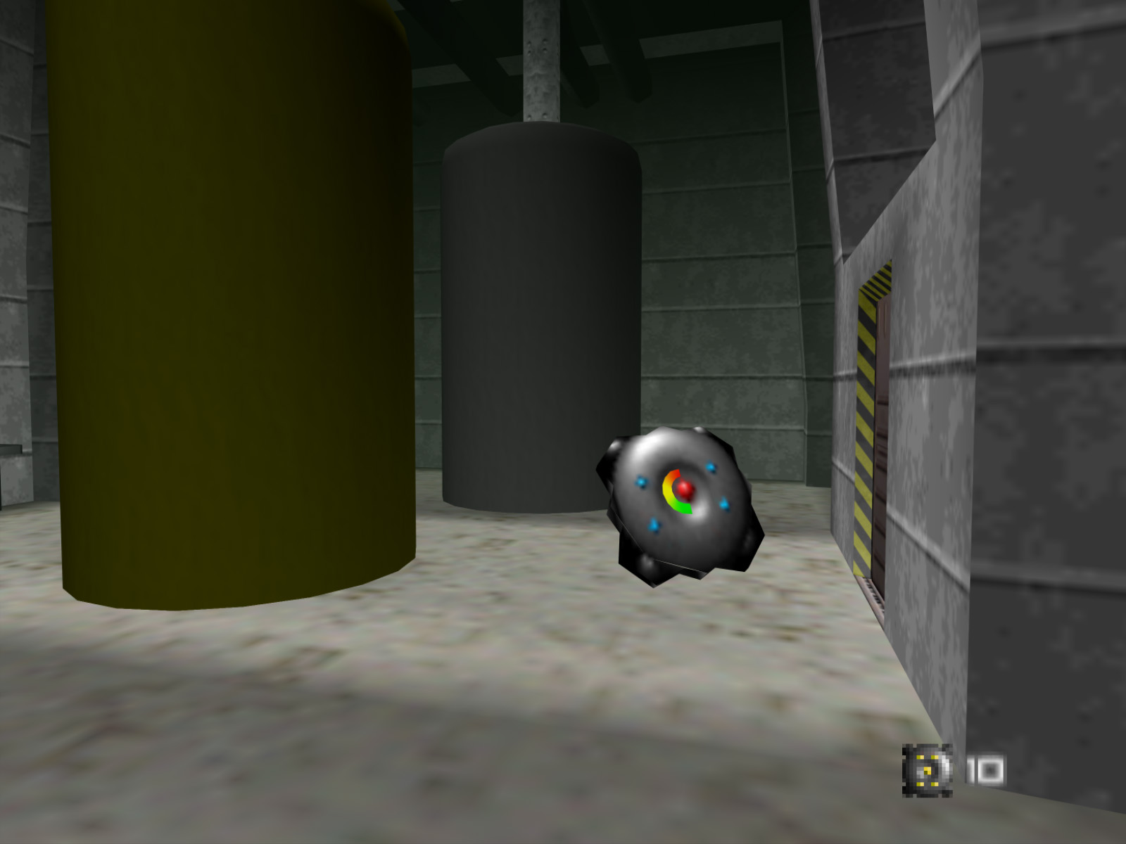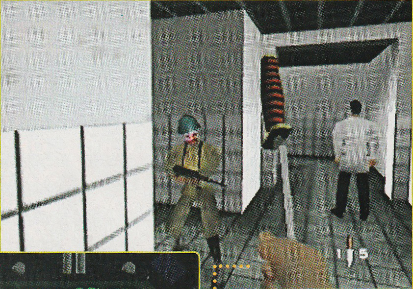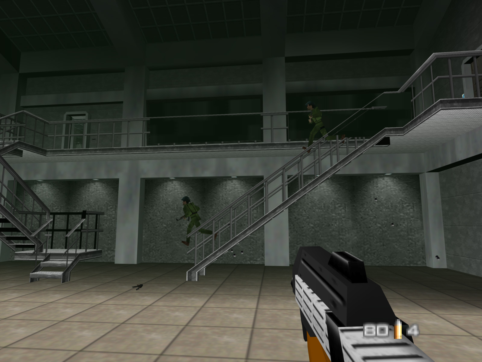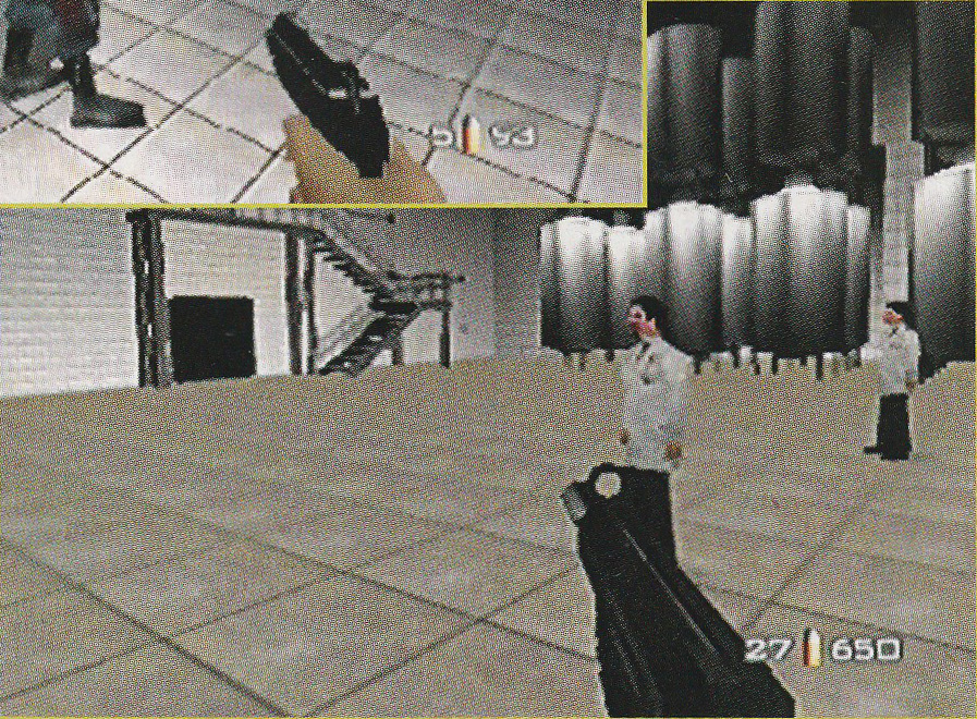 One of the tanks was given yellow vertex colors to add a bit of color to a very gray level. There is also a Scientist standing where none does in the final. It seems that in this version of GoldenEye the Scientists did not yet work at their terminals. In fact the terminals don't seem to be there at all. You can just barely see one on the far left of the final screenshot while the prerelease one lacks it.
