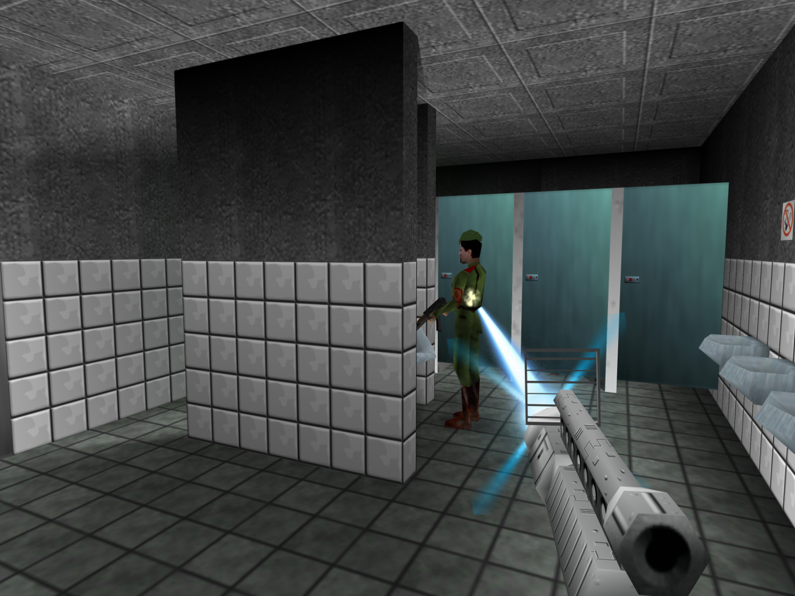 The bathroom had a very different style in early 1997 with white walls, beige tile ceiling, and rusty steel stall doors. It looks like the no smoking signs had yet to be added. You can also see a gun sticking through the rightmost stall door. In the final game that guard is moved to the stall one over to the left.