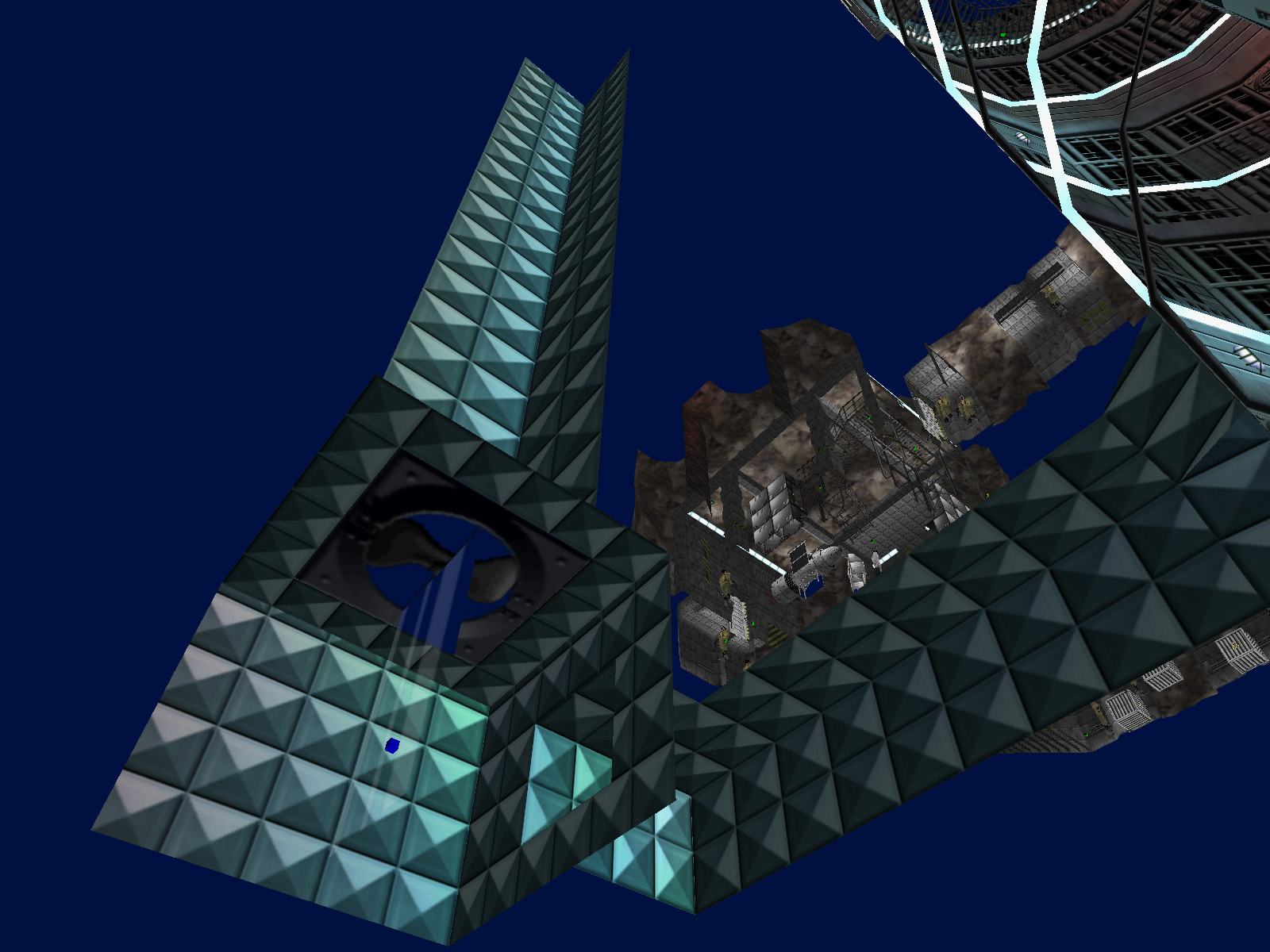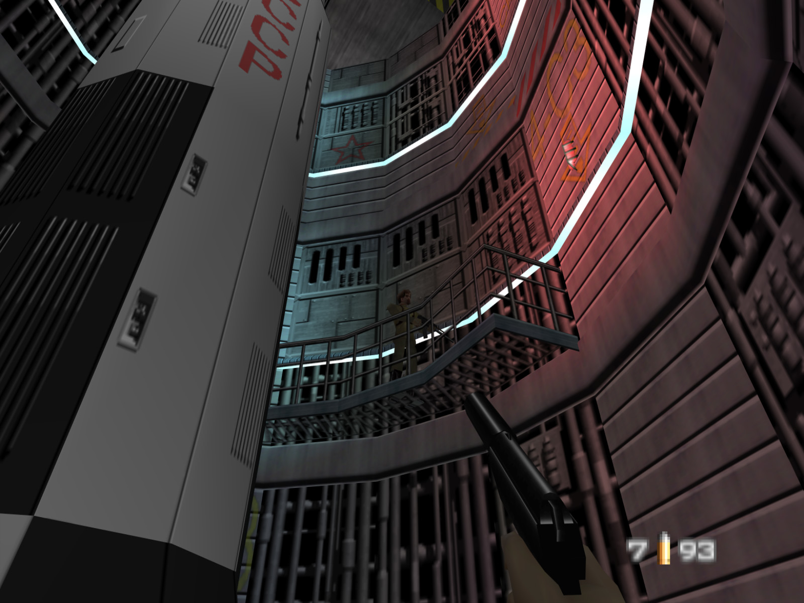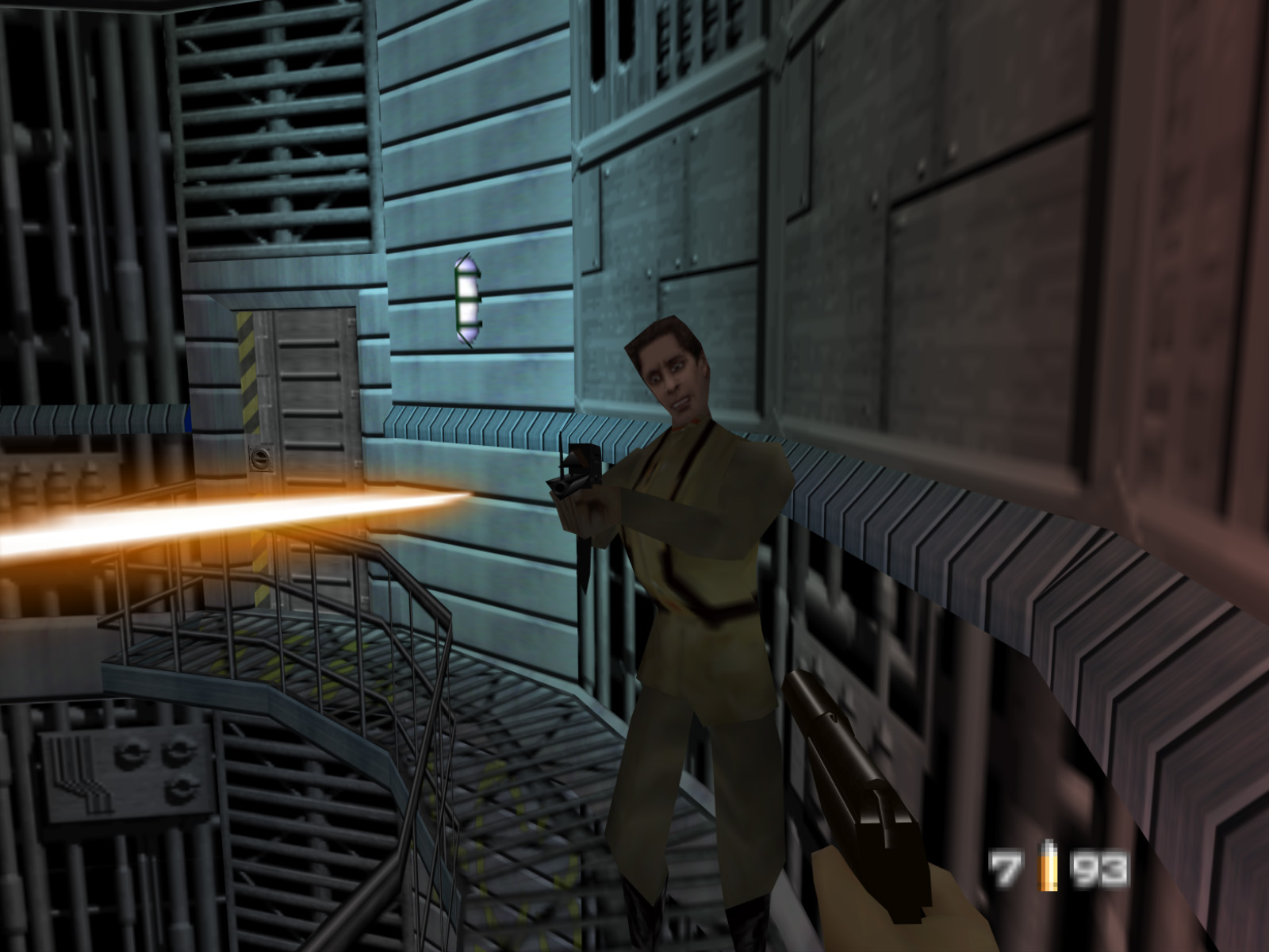 In this image I've used the GoldenEye Setup Editor to set the start point to this mysterious catwalk. The guard will notice you as soon as the level starts and he acts like a normal guard.