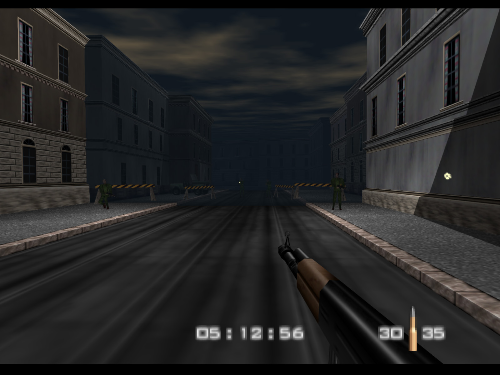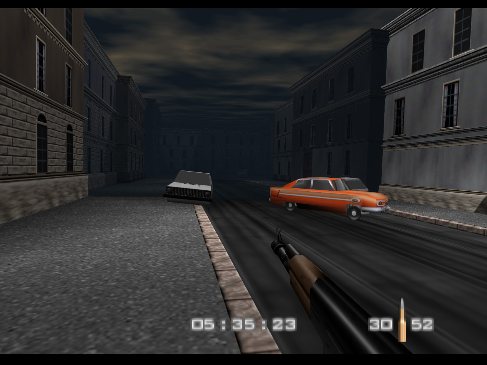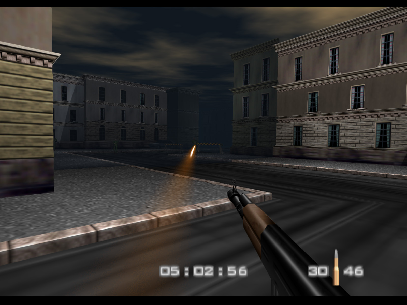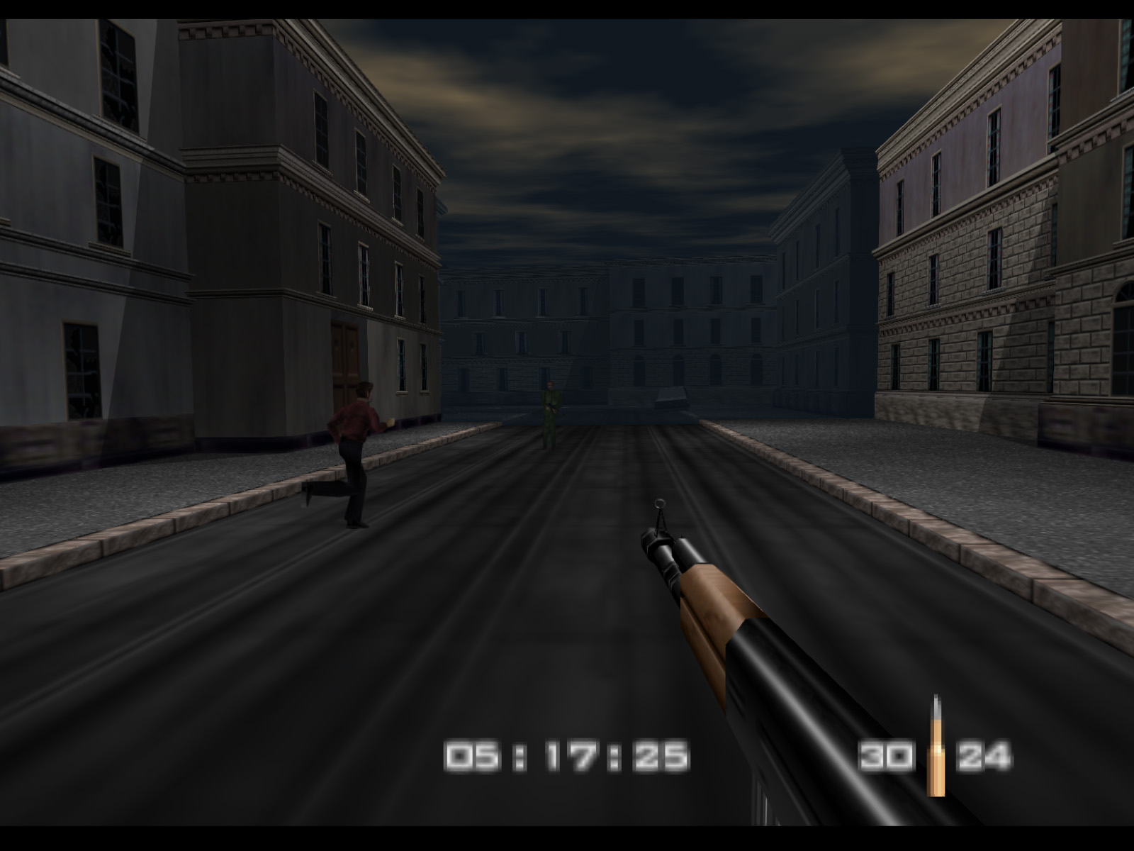 Streets begins in the same alleyway where Archives ended. On Agent difficulty you are given five minutes to finish the level before Ourumov escapes with Natalya. On Secret Agent and 00 Agent you have three minutes to meet with Valentin so that he will delay Ourumov and give you more time.