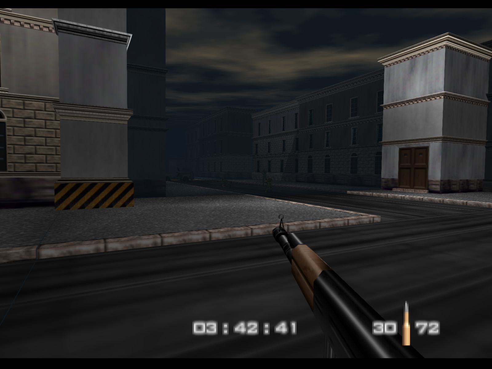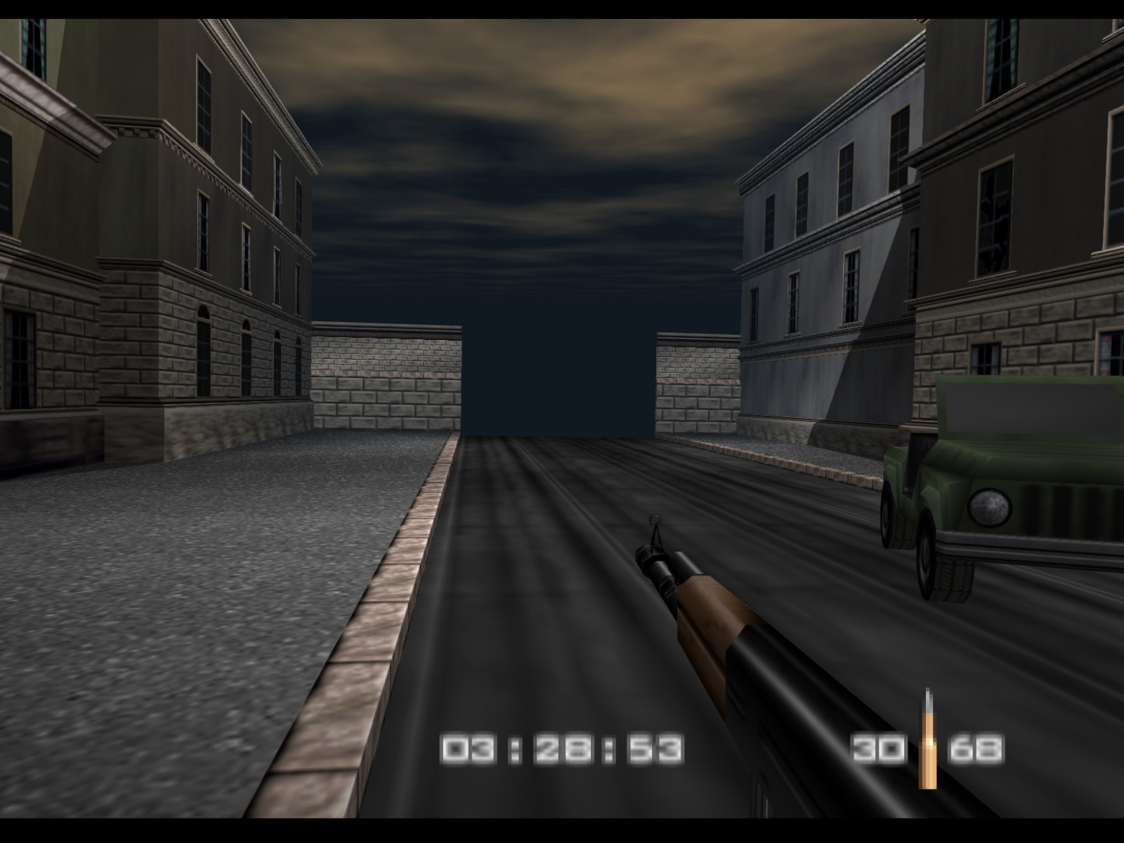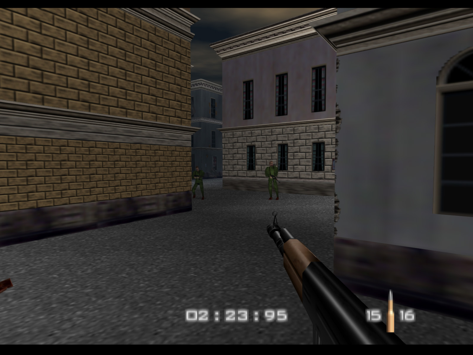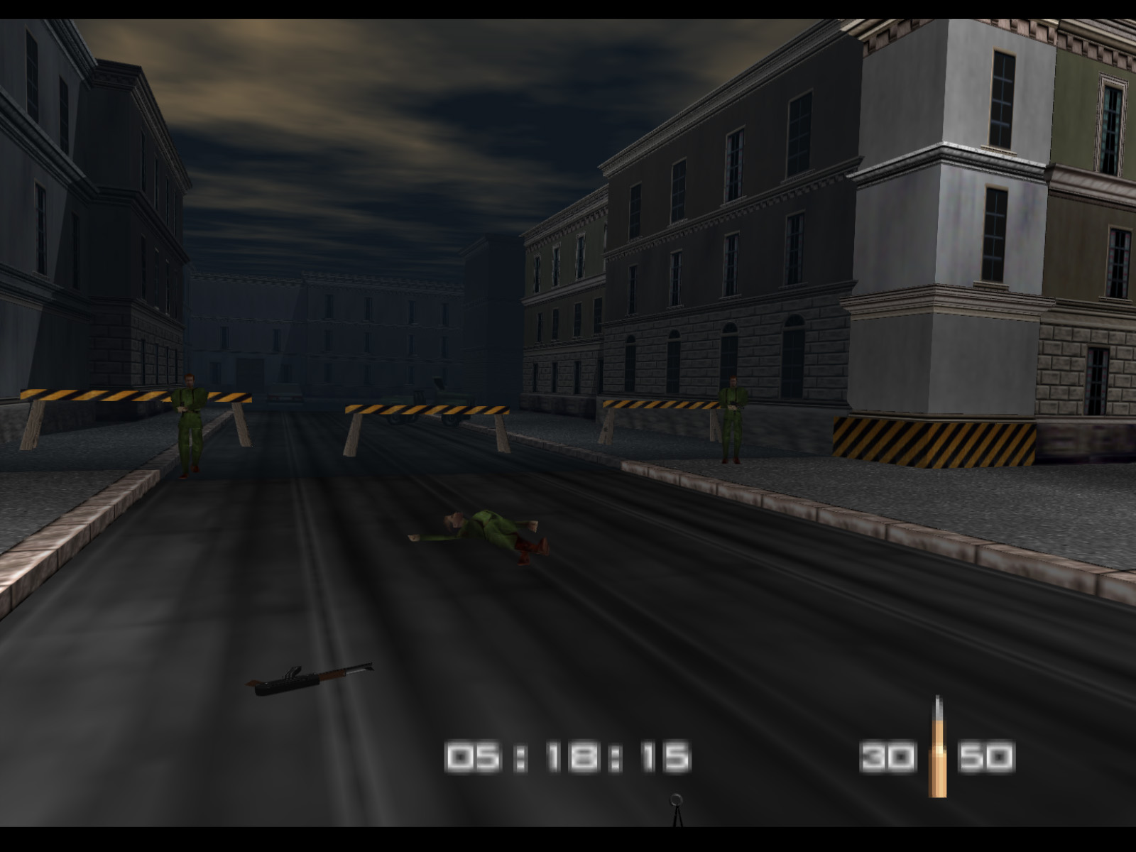 Streets begins in the same alleyway where Archives ended. On Agent difficulty you are given five minutes to finish the level before Ourumov escapes with Natalya. On Secret Agent and 00 Agent you have three minutes to meet with Valentin so that he will delay Ourumov and give you more time.