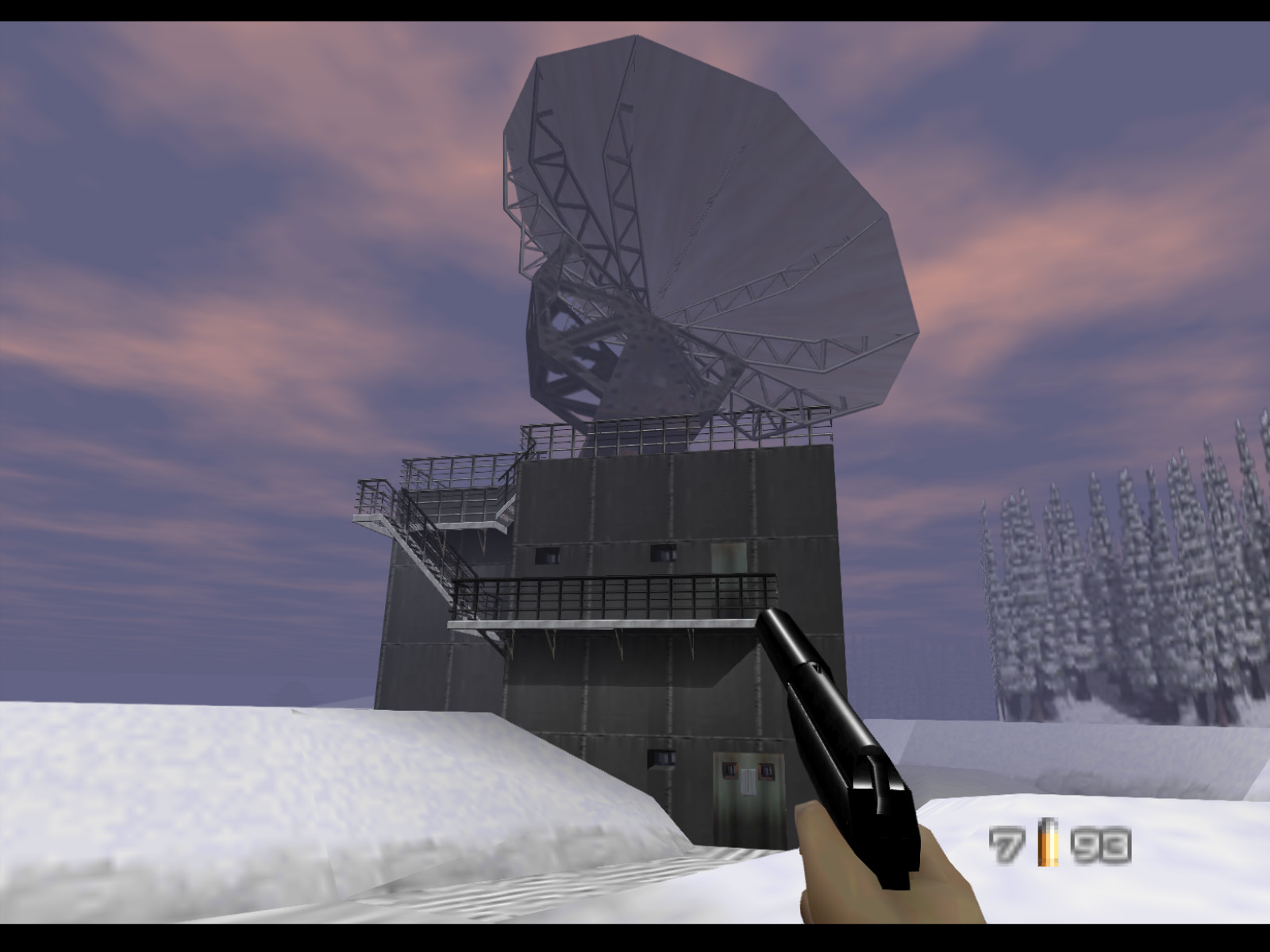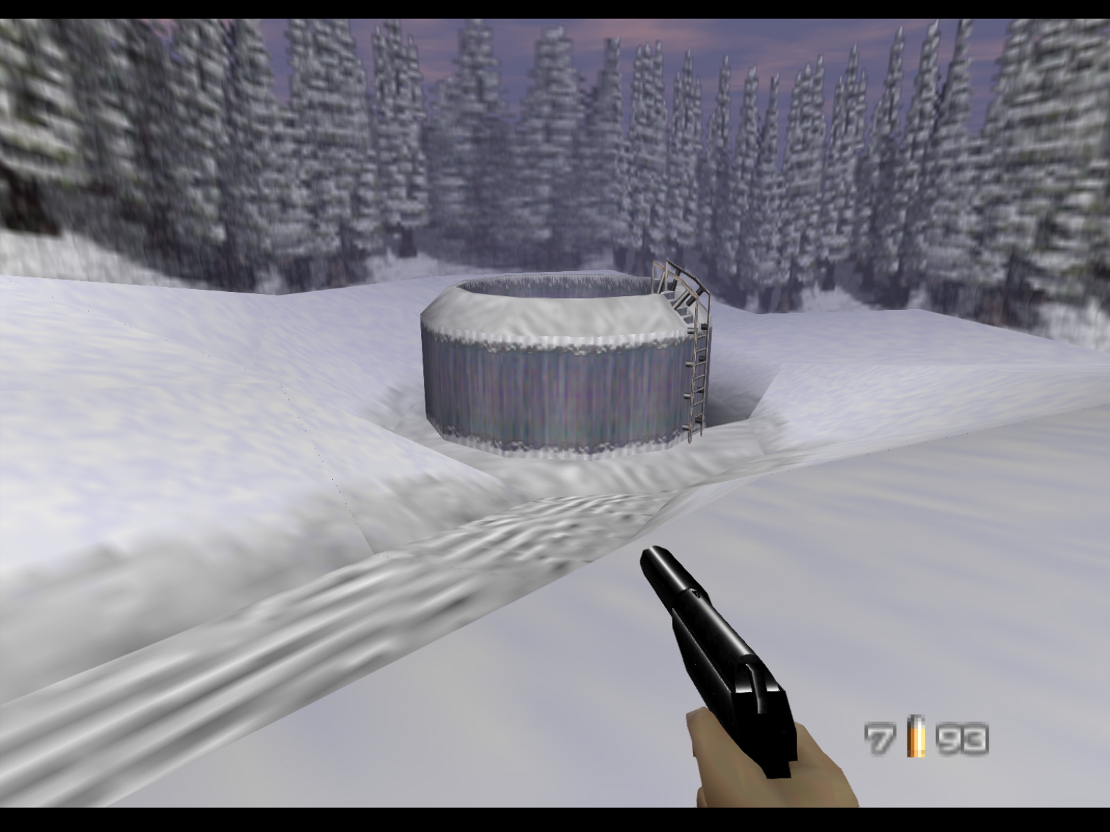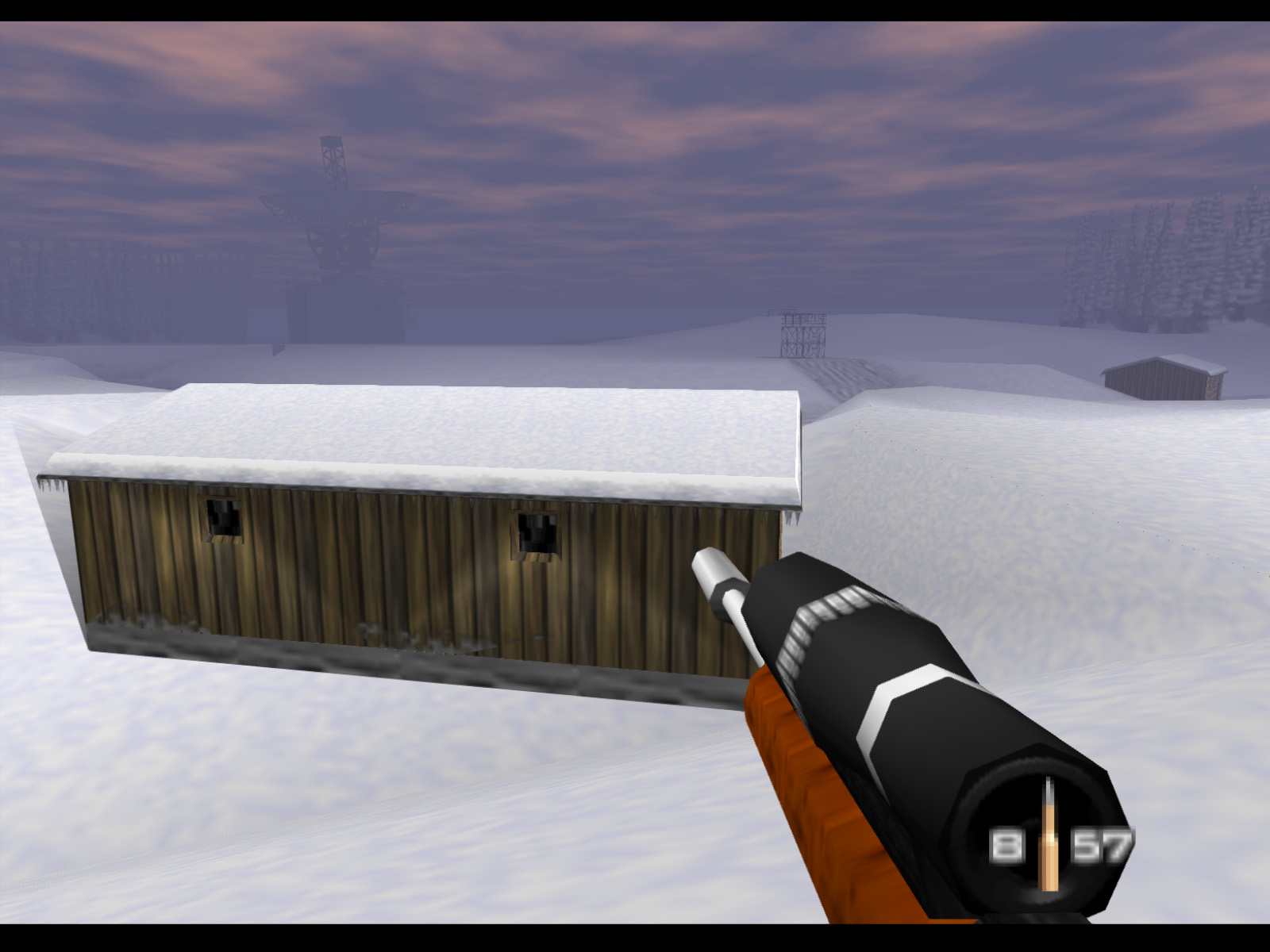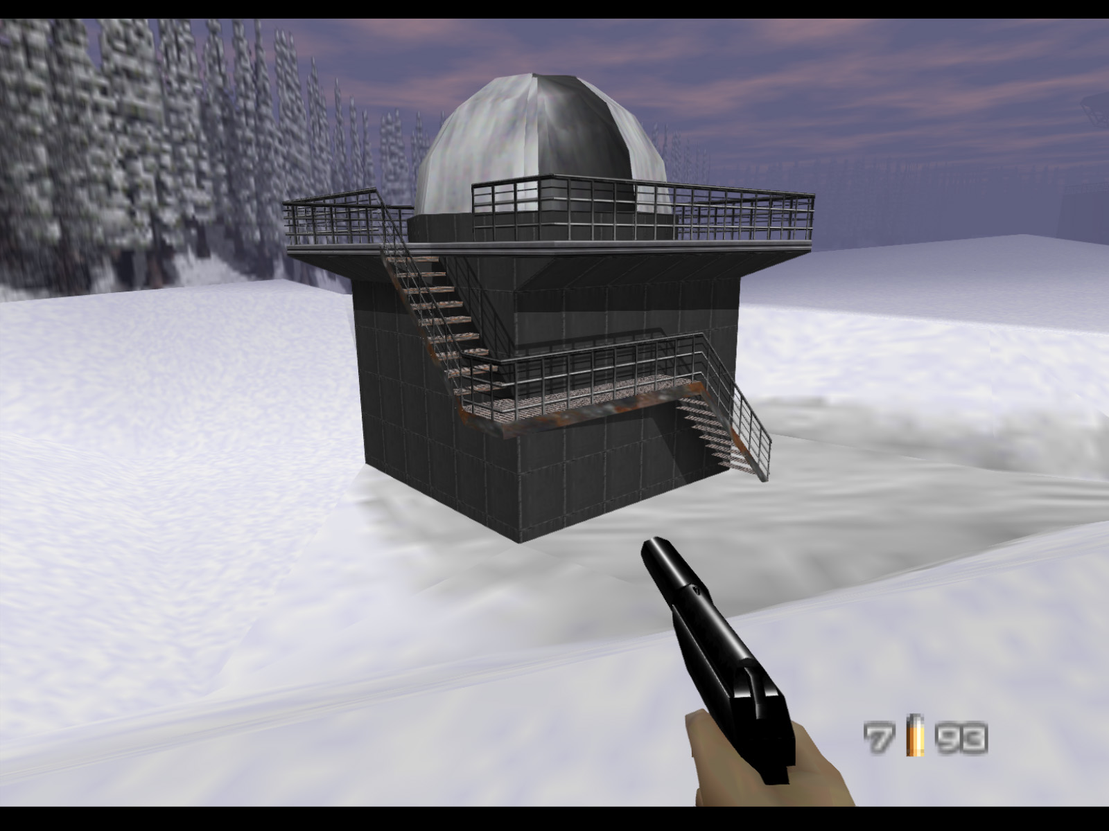 Surface is the most spatially open level in GoldenEye — a vast expanse of tundra dotted with buildings and crisscrossed by sunken paths. The installation encompasses an enormous communications dish, an observatory, a helipad, a cooling tower for the bunker, sniping platforms, and eight cabins grouped in pairs. The primary entrance to the bunker is located by the helipad, but for this mission the player is instructed to infiltrate through the cooling tower. The level's overall dimensions are about 316 x 342 meters.