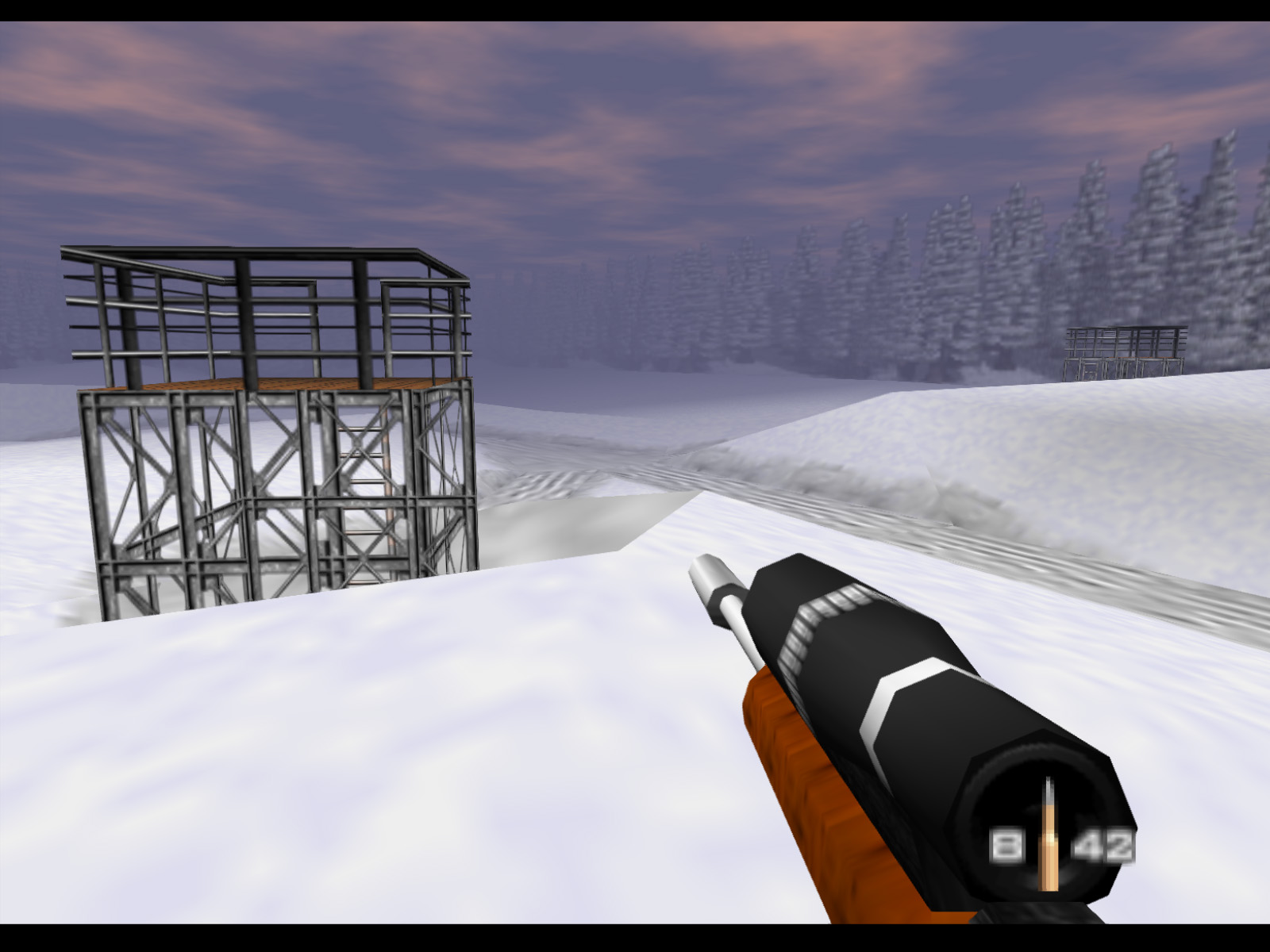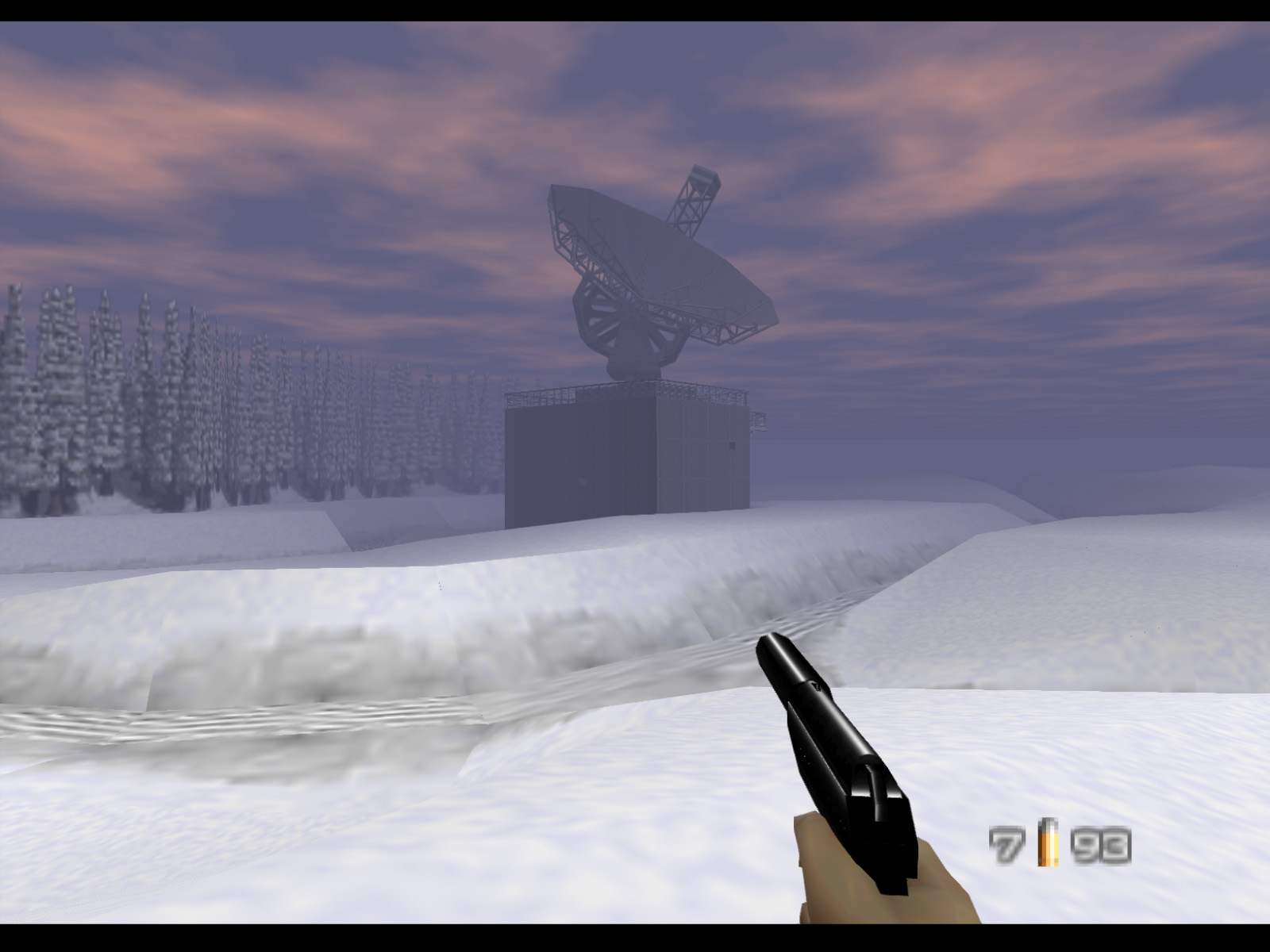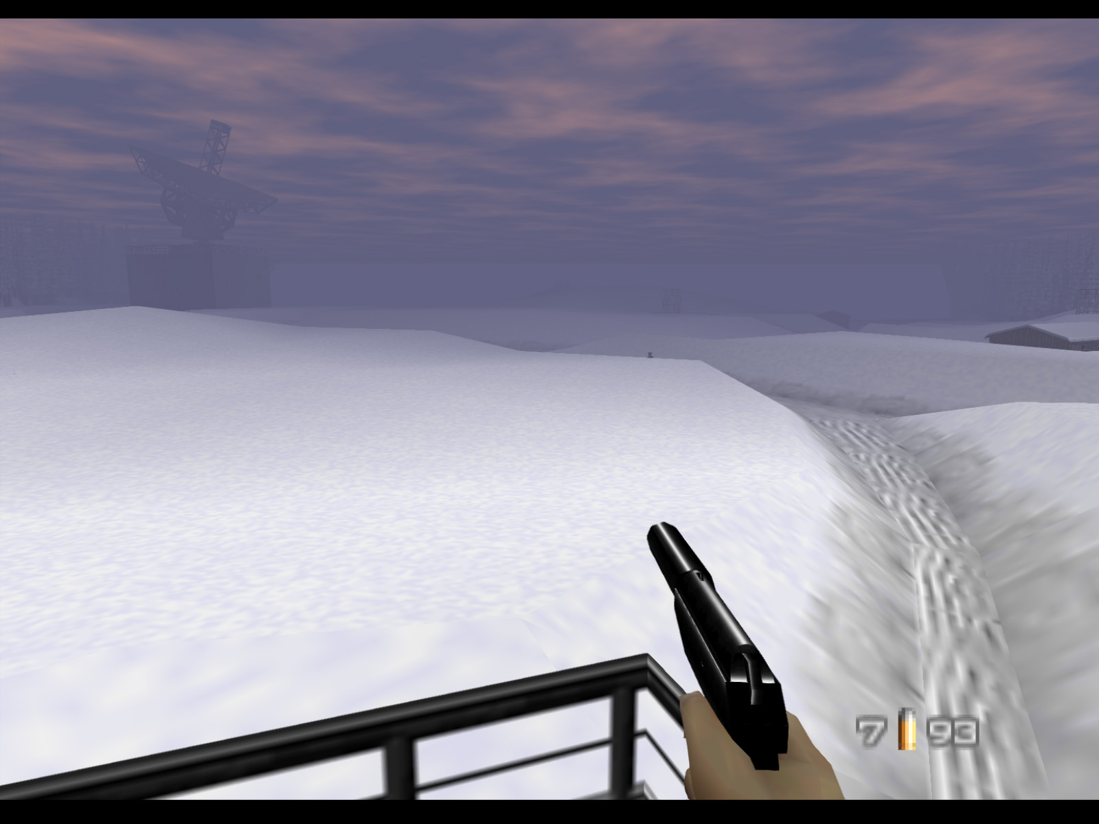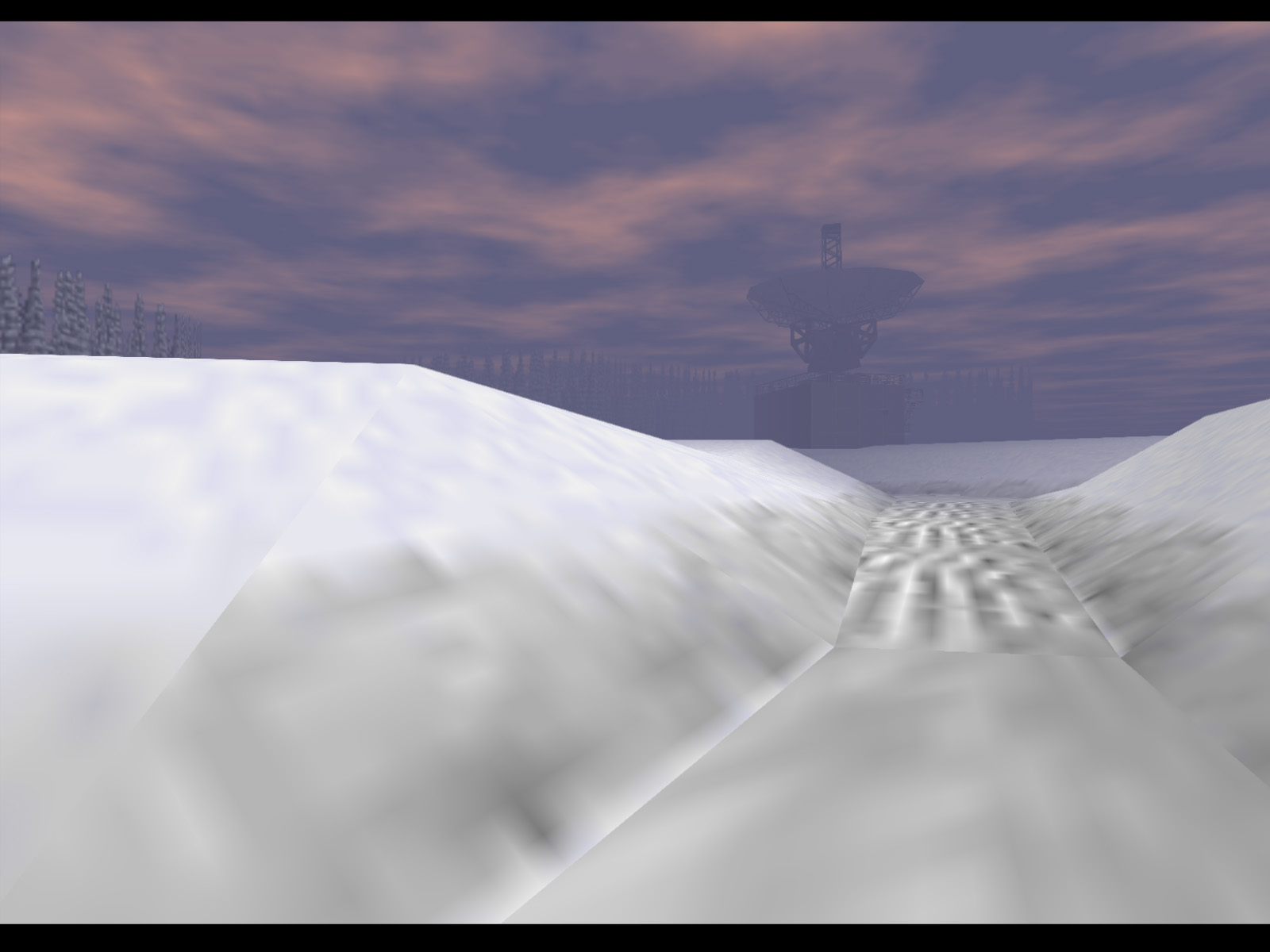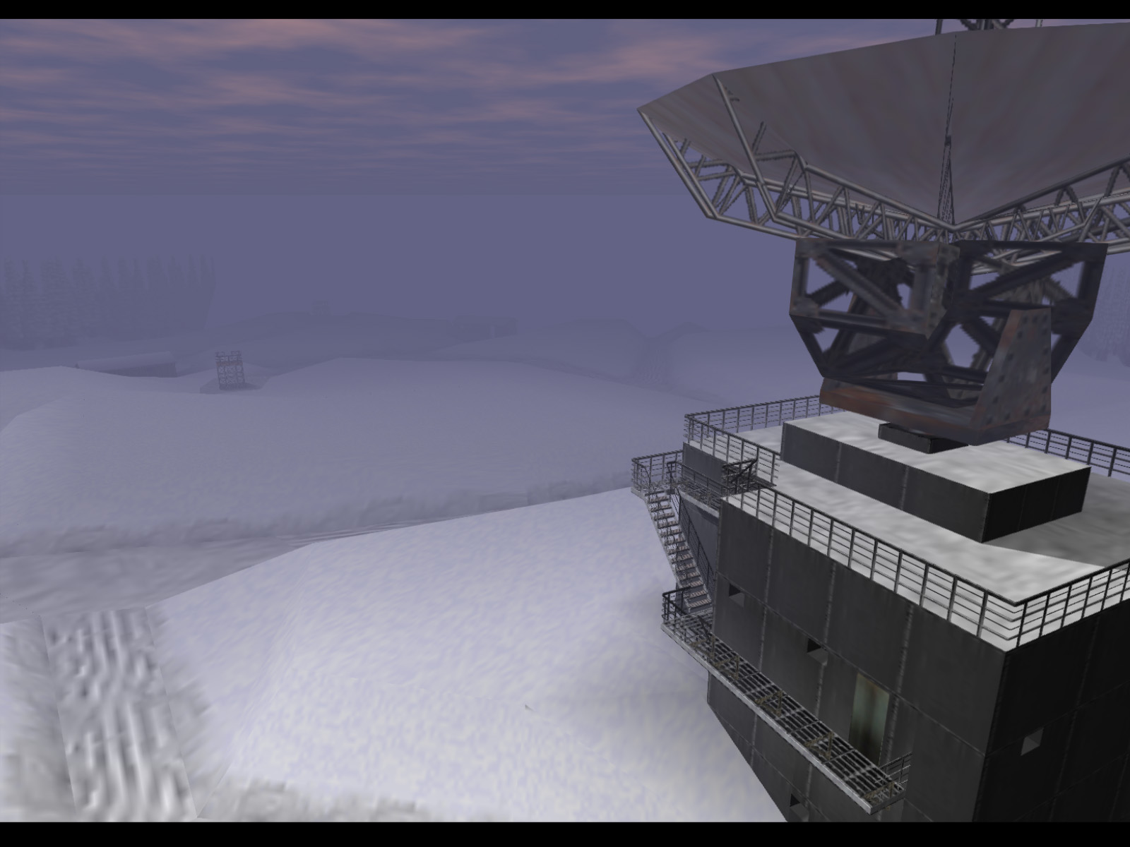 Surface is the most spatially open level in GoldenEye — a vast expanse of tundra dotted with buildings and crisscrossed by sunken paths. The installation encompasses an enormous communications dish, an observatory, a helipad, a cooling tower for the bunker, sniping platforms, and eight cabins grouped in pairs. The primary entrance to the bunker is located by the helipad, but for this mission the player is instructed to infiltrate through the cooling tower. The level's overall dimensions are about 316 x 342 meters.