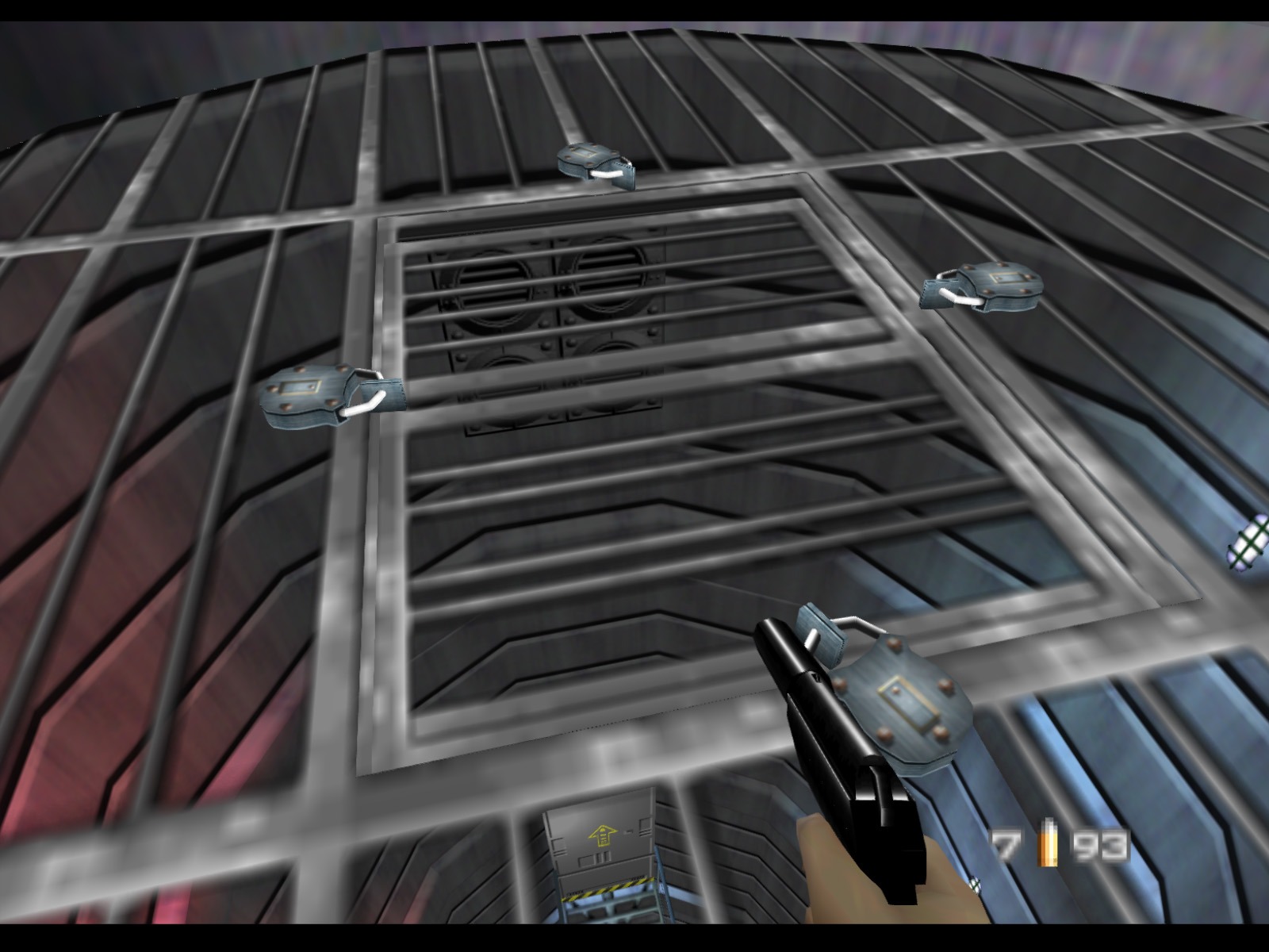 Destroy all four padlocks on the hatch to make it fall away. Drop down the shaft to complete Objective D and exit the level.