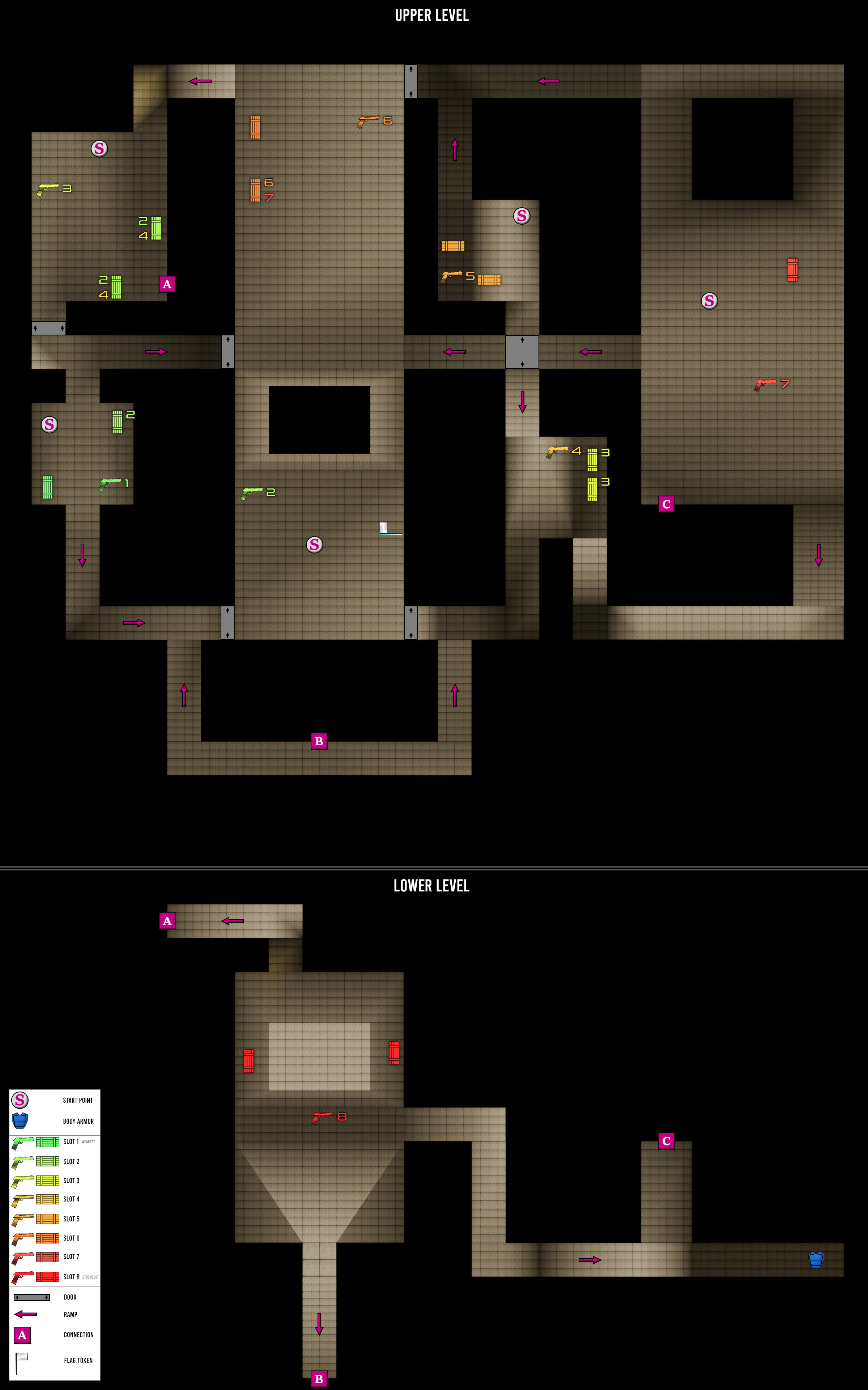 Temple has the strangest weapon and ammo spawn setup of any arena. Many weapon spawns are not paired with ammo spawns of the same slot. There are also a lot of double crates i.e. places where two ammo crates are spawned at the same location. Double crates are marked with two numbers next to them. You can confirm for yourself that these are double crates by shooting them which causes them to separate. Crates that are not adjacent to a weapon of the same slot are also marked with a number.