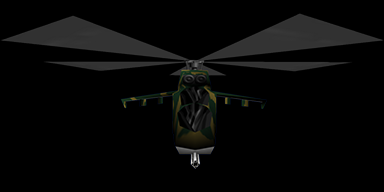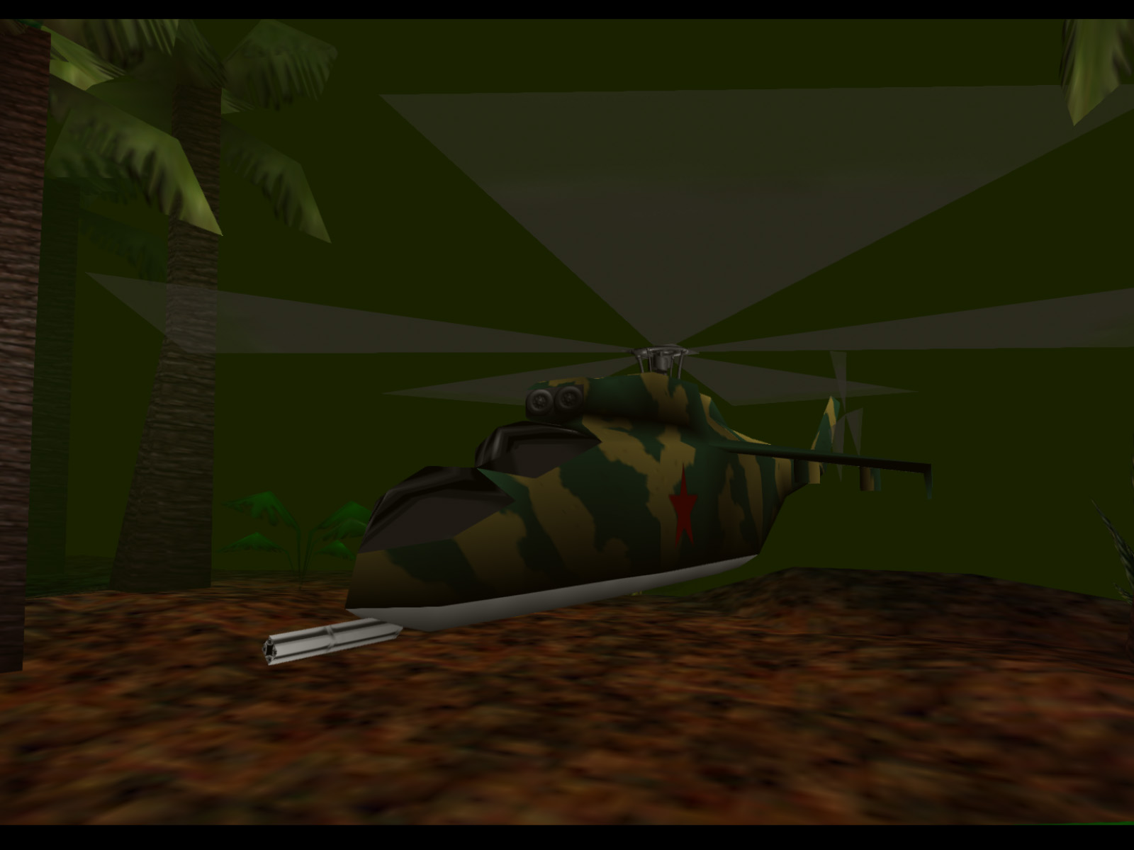 Model of a Soviet Mil Mi-24 Hind helicopter gunship. It has red stars on the sides and bottom as well as the number 15 painted on the bottom. We do not know where it was meant to be used, but the camouflage pattern fits Jungle well. Would it have attacked the player? Would Xenia have rappelled down from it? It could have also been made for Dish/Perimeter or perhaps even with no planned purpose at all. The windows have proper reflections, making this model feel more finished than the truck above.