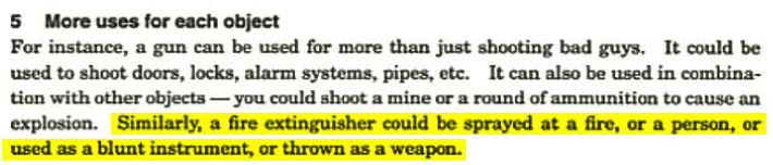 A very simplistically modeled fire extinguisher. The "chr" prefix in the model name is quite interesting because it is used to indicate models that can be picked up and/or used by characters. The game's design document actually brings up a fire extinguisher as both a tool and a weapon. It seems the developers had some ideas for this extinguisher which never came to fruition. Perhaps ironically, it makes a huge fiery explosion when shot. It leaves behind smoke that spins very quickly.