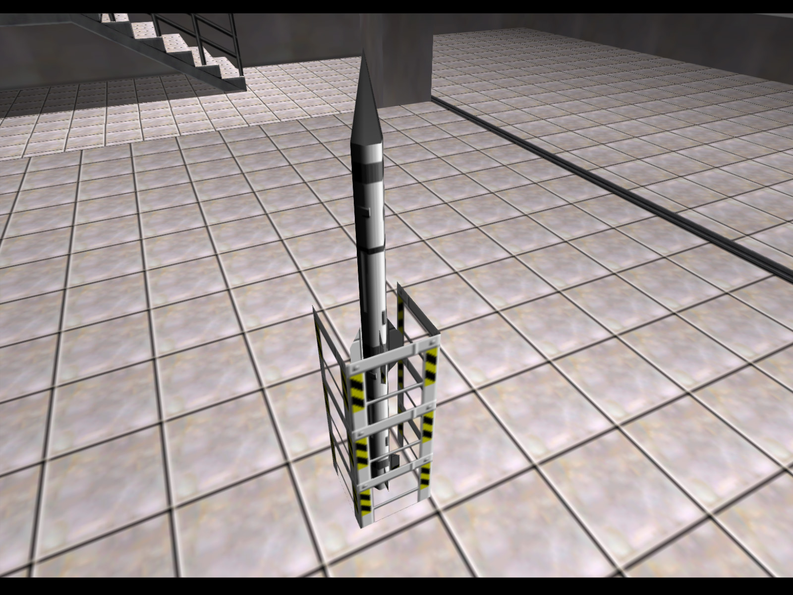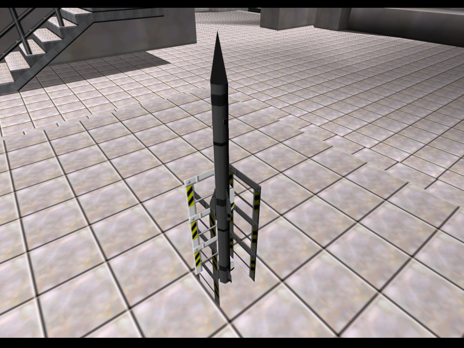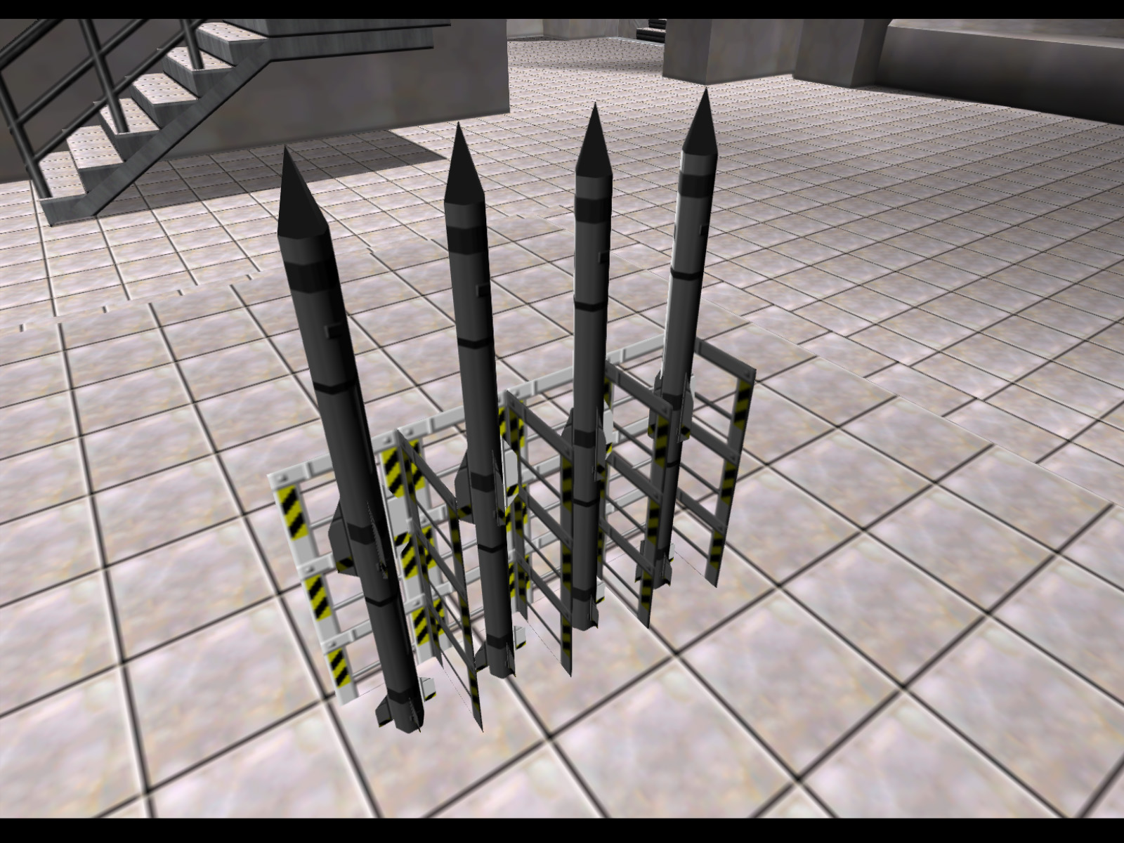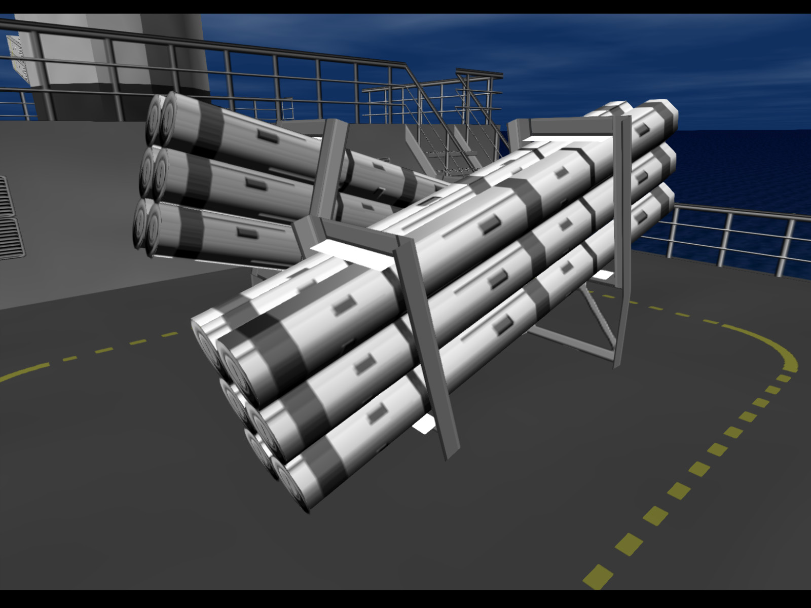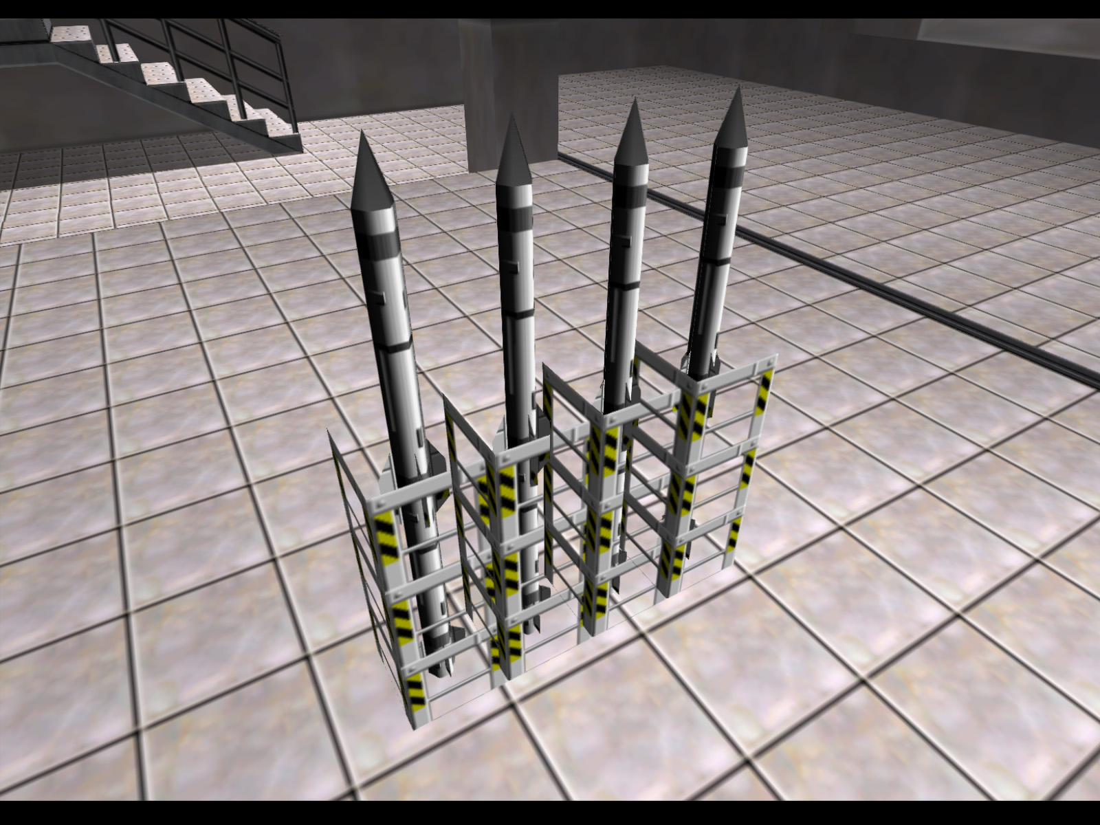 The same missile as before, but slightly shorter and in a row of 4. The side of the end missile's rack is missing, which would have allowed this prop used modularly.