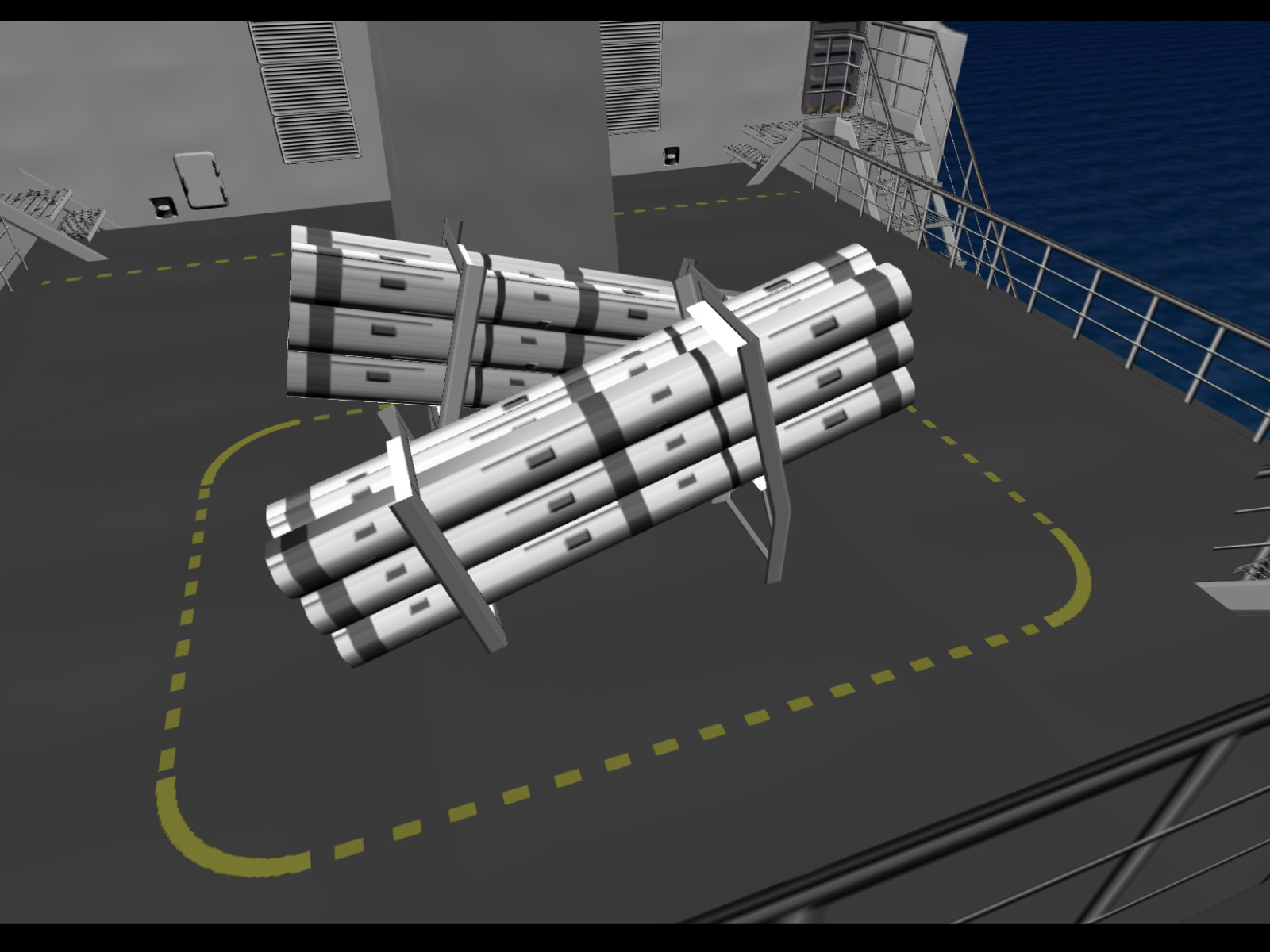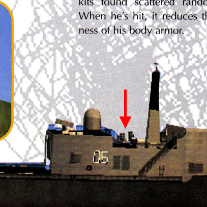 A cool looking launcher for Harpoon anti-ship missiles. We know exactly where these were meant to go thanks to a prerelease shot of the level. The pads for them still exist and it's very easy to add them back with the Setup Editor. It is unknown why these were removed.